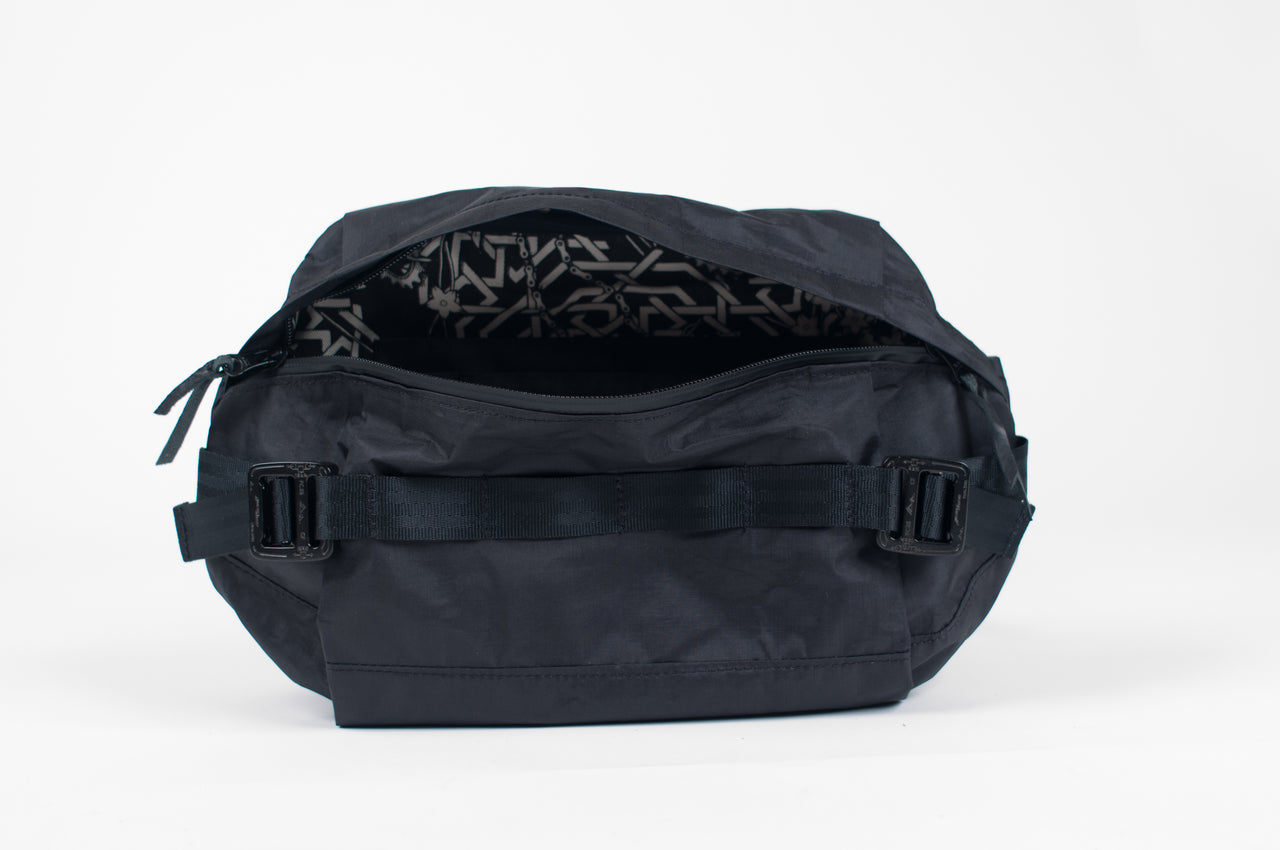 The outward facing is constructed from Dyneema 170gsm composite fabric. With a bellows compression to keep your belongings in place during activity, the compression is tensioned by two Cobra frame tension locks on a 5 bar webbing. The main compartment is accessed by a YKK 6mm nylon coil Aquaguard zipper. Internally there are three sleeves (phone / sunglasses size) and a pen slot. The bag is lined with their signature crank design hand printed on a natural cotton drill.