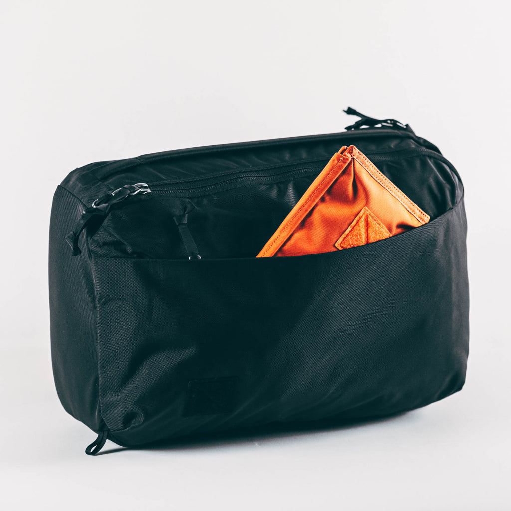 Vertical orientation allows side access while wearing or from the ground. Internal drop-in pocket for phone-sized items (wallet, passport, etc). Zippered mesh. pocket for smaller items. Small volume accommodates flat items like: notebook or field guide, maps, tickets/boarding passes, etc.