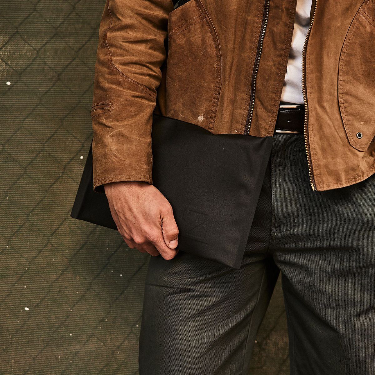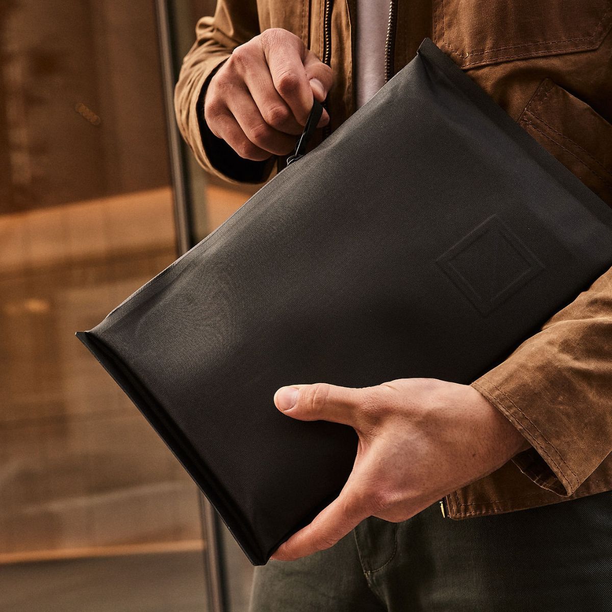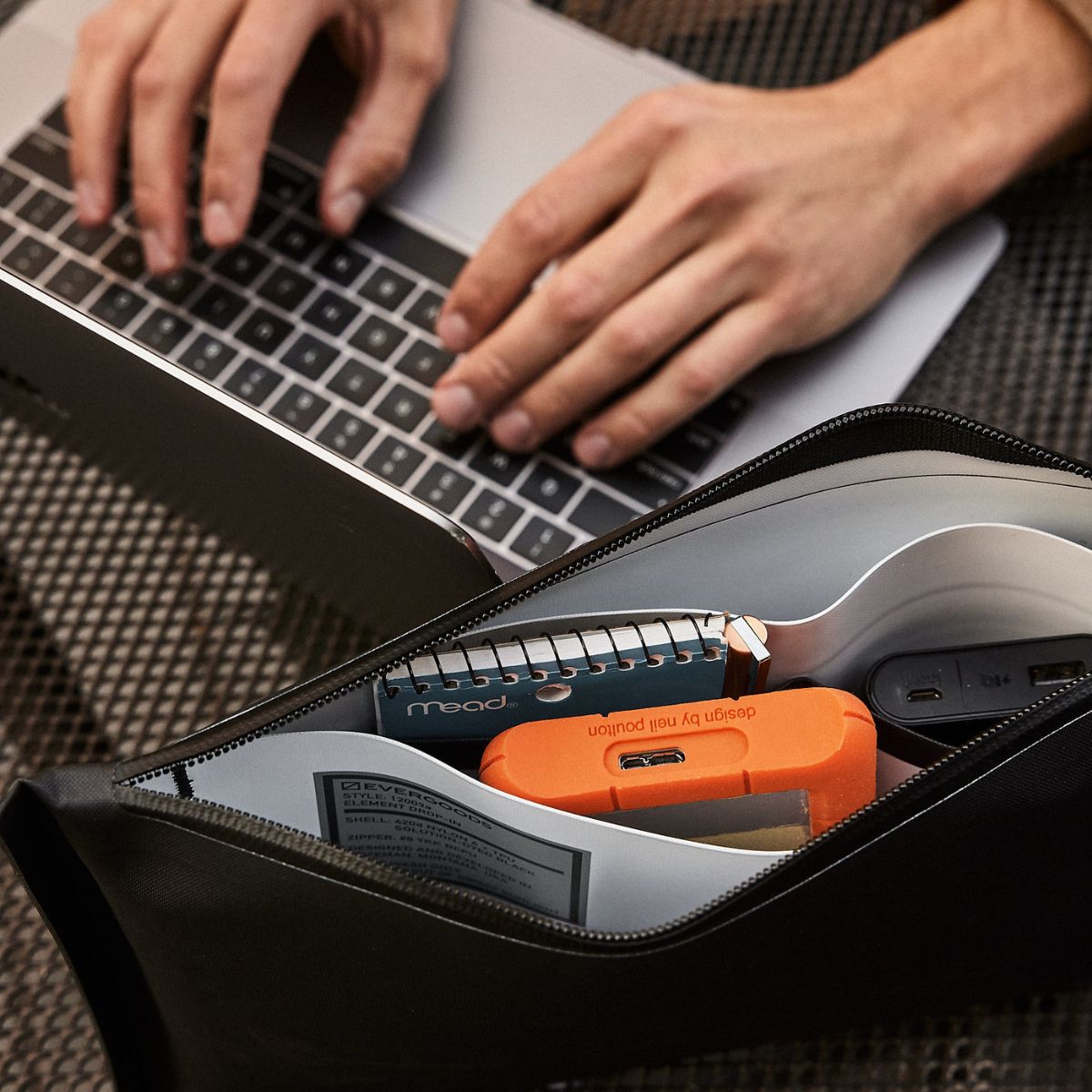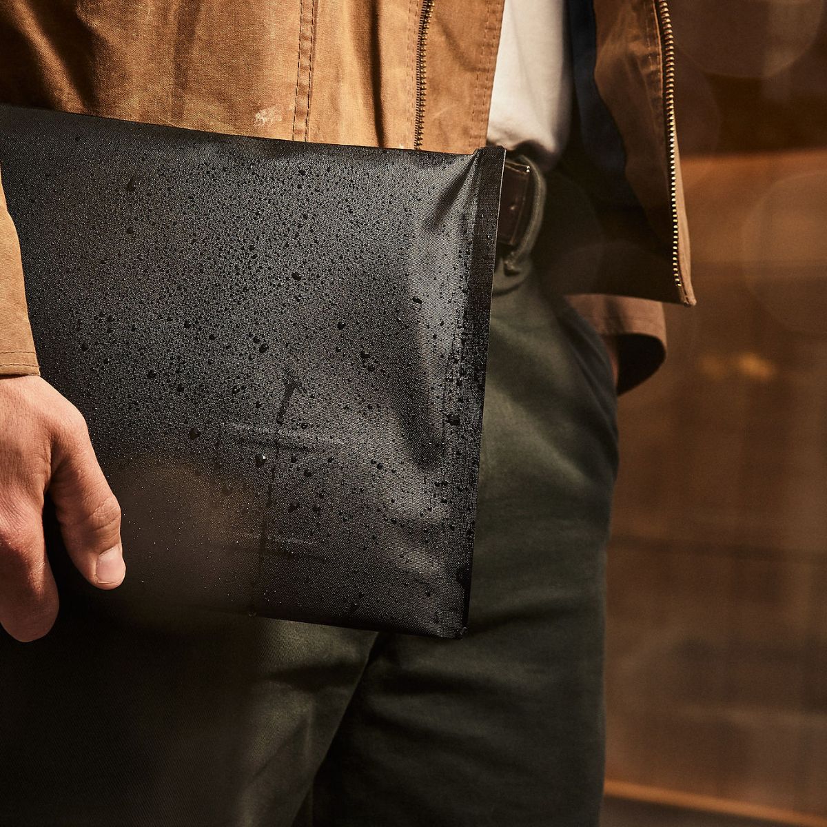 EDI was designed to prioritize handheld carry as your quick-access clutch, but it also excels as a a extra layer of weather protection within our backpacks and duffel. EDI fits in our stretch woven sleeves and laptop compartments for all standard EVERGOODS bags.