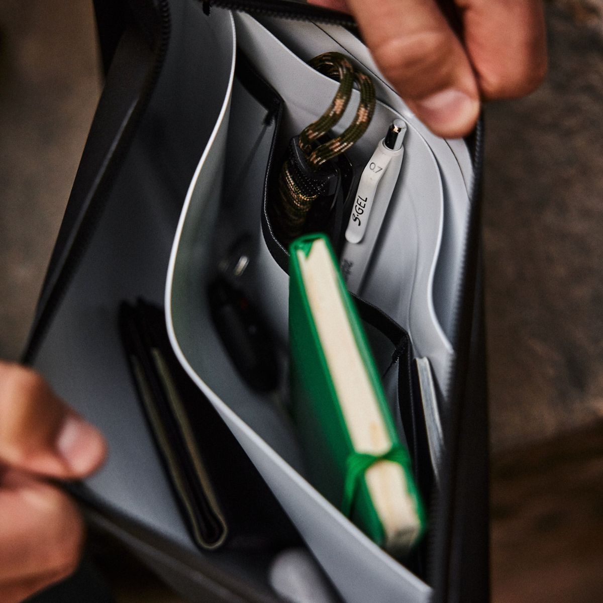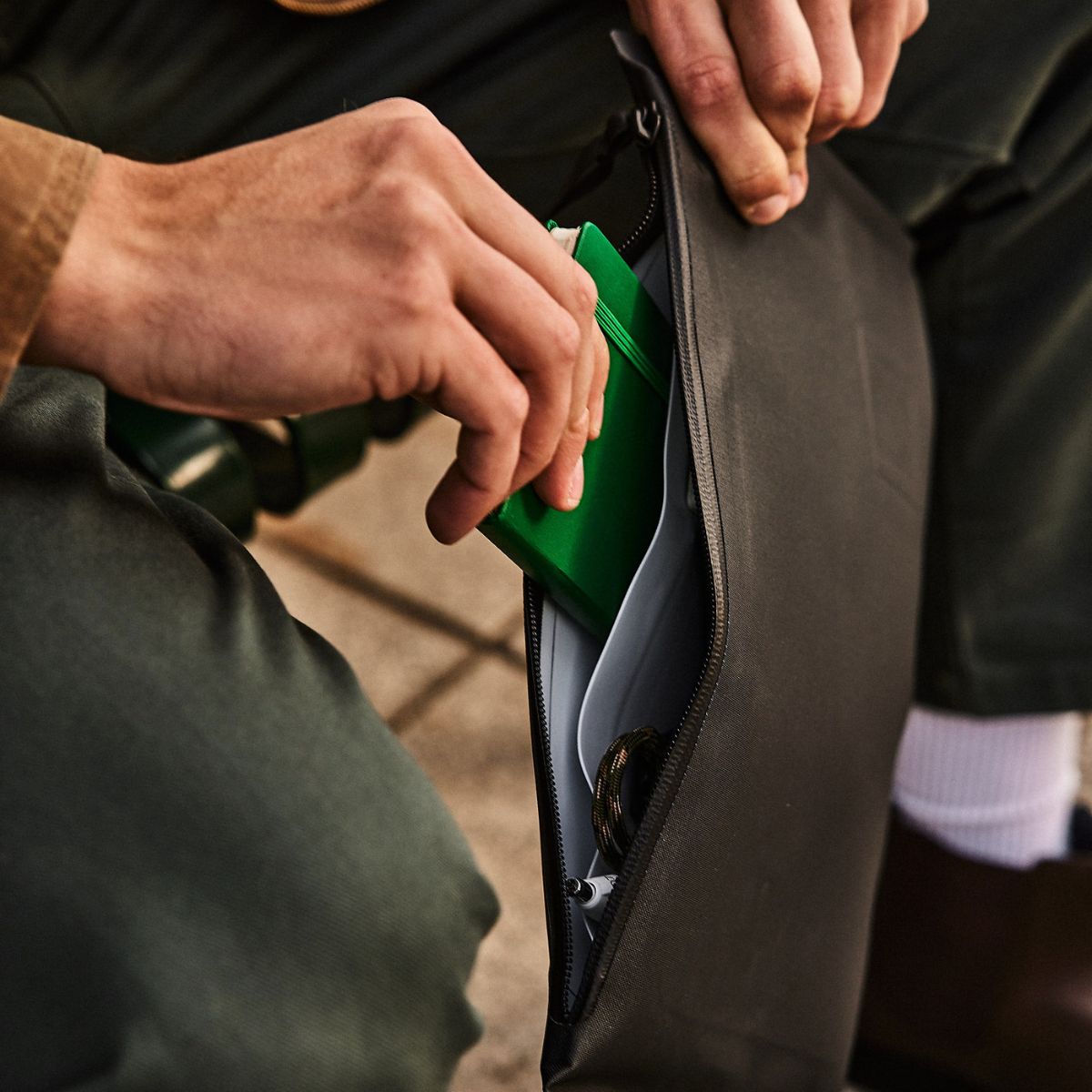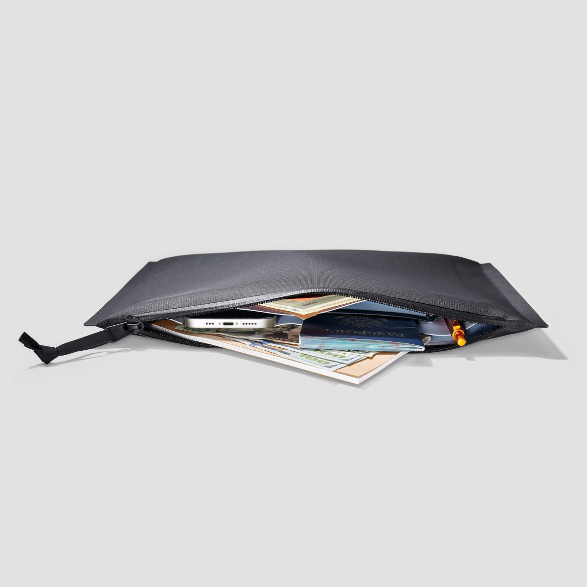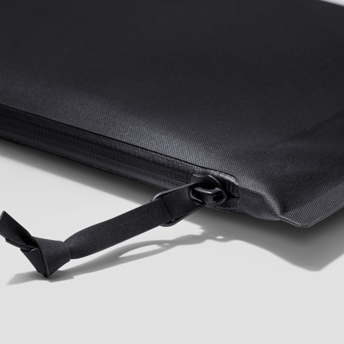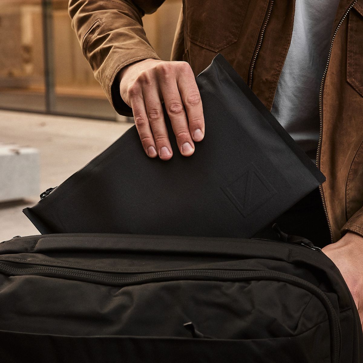 EDI was designed to prioritize handheld carry as your quick-access clutch, but it also excels as a a extra layer of weather protection within our backpacks and duffel. EDI fits in our stretch woven sleeves and laptop compartments for all standard EVERGOODS bags.