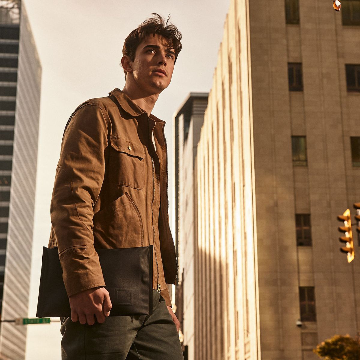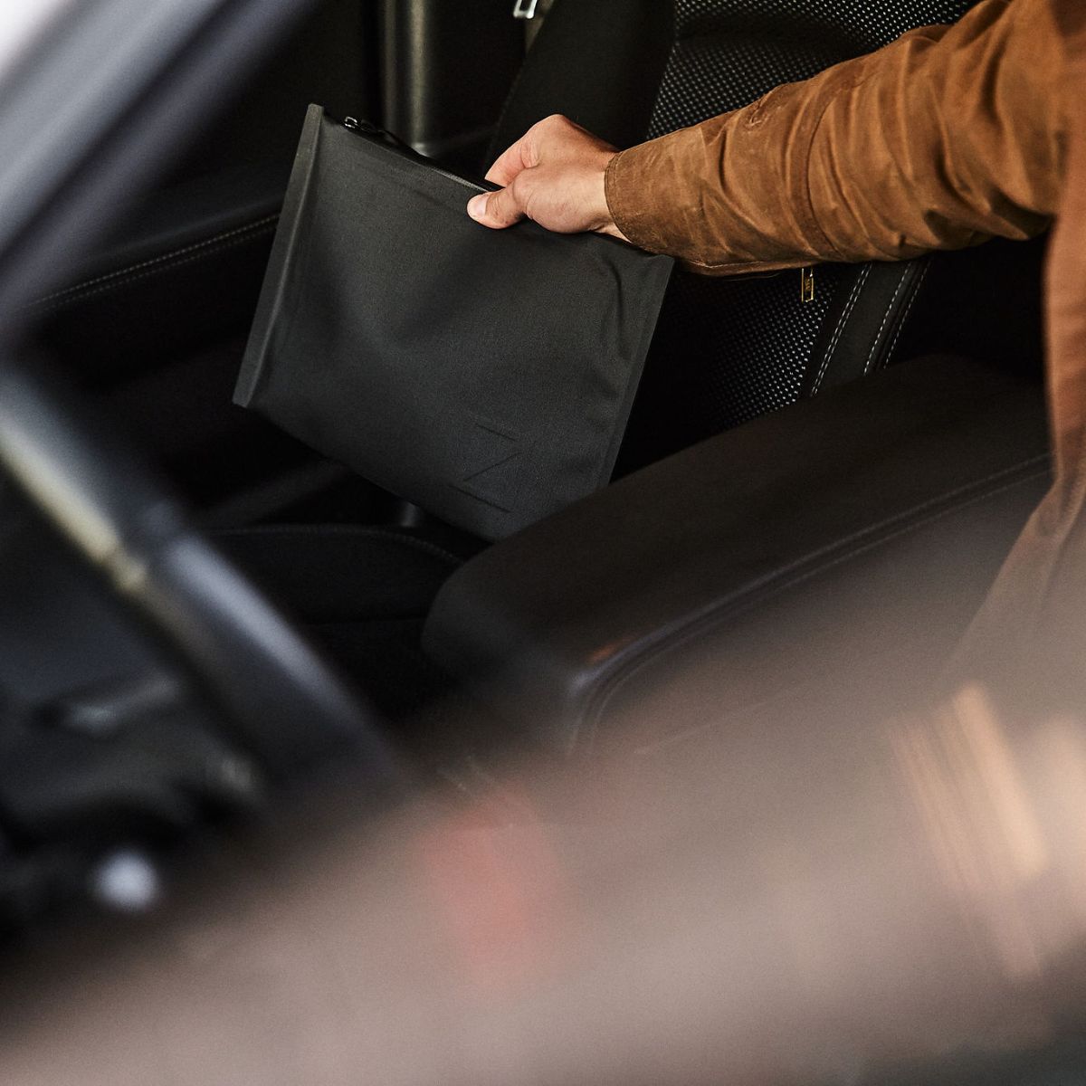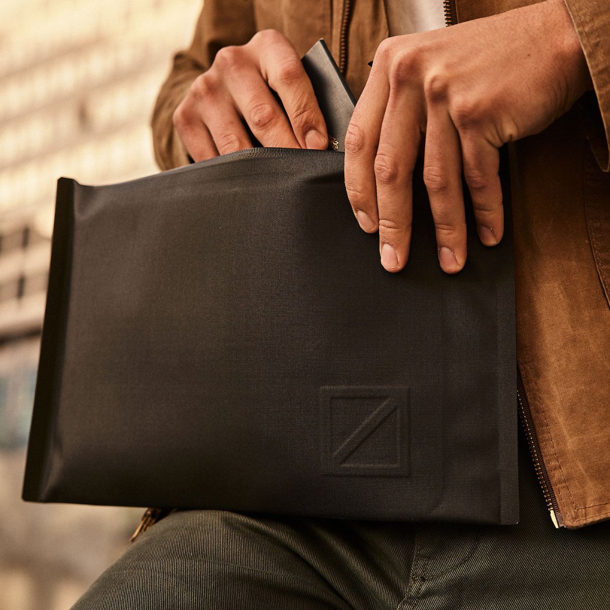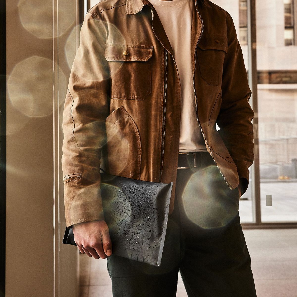 EDI was designed to prioritize handheld carry as your quick-access clutch, but it also excels as a a extra layer of weather protection within our backpacks and duffel. EDI fits in our stretch woven sleeves and laptop compartments for all standard EVERGOODS bags.