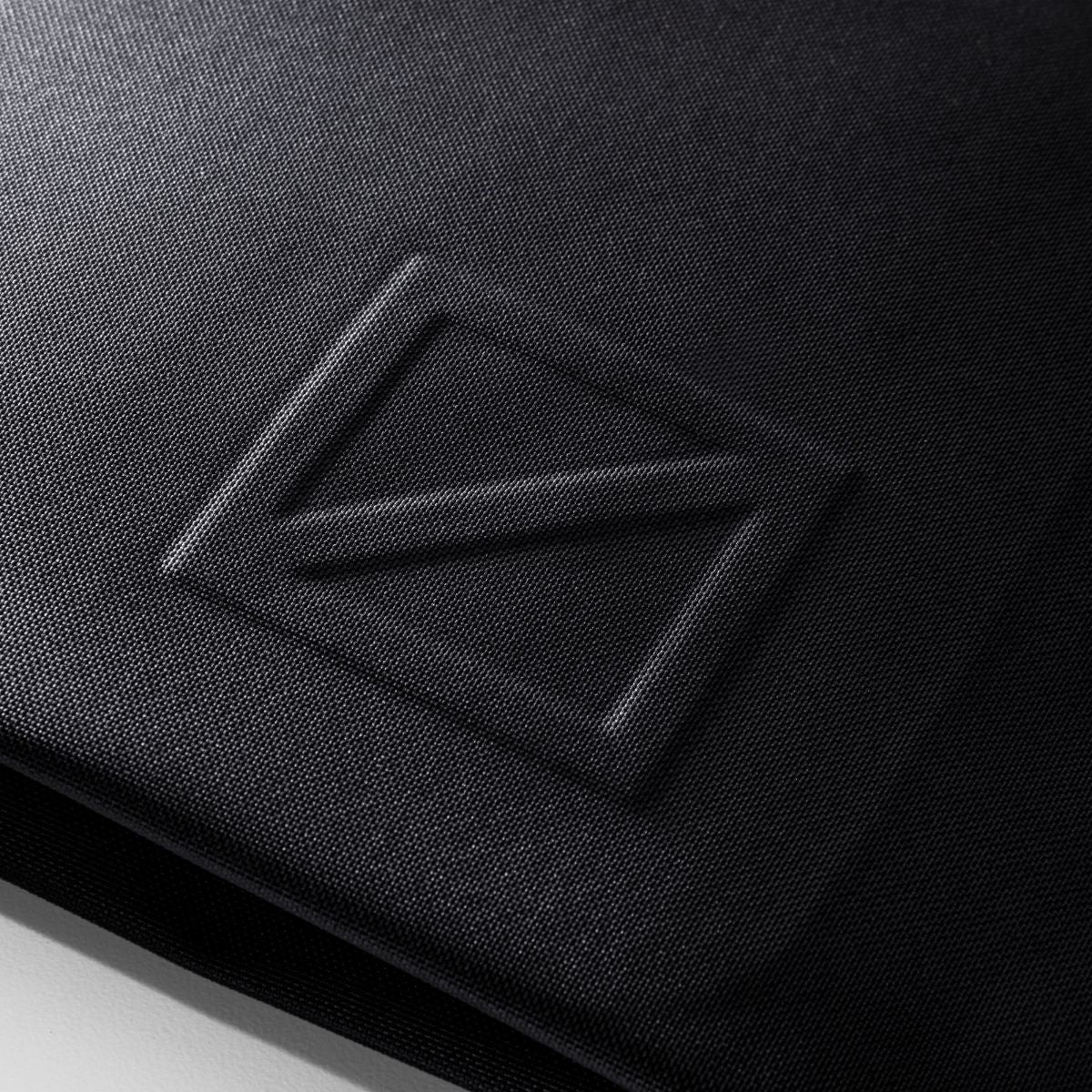 A custom-developed solution dyed black 420D nylon 6, finished with a white PU laminate on the back and PU kiss-coat on the face.