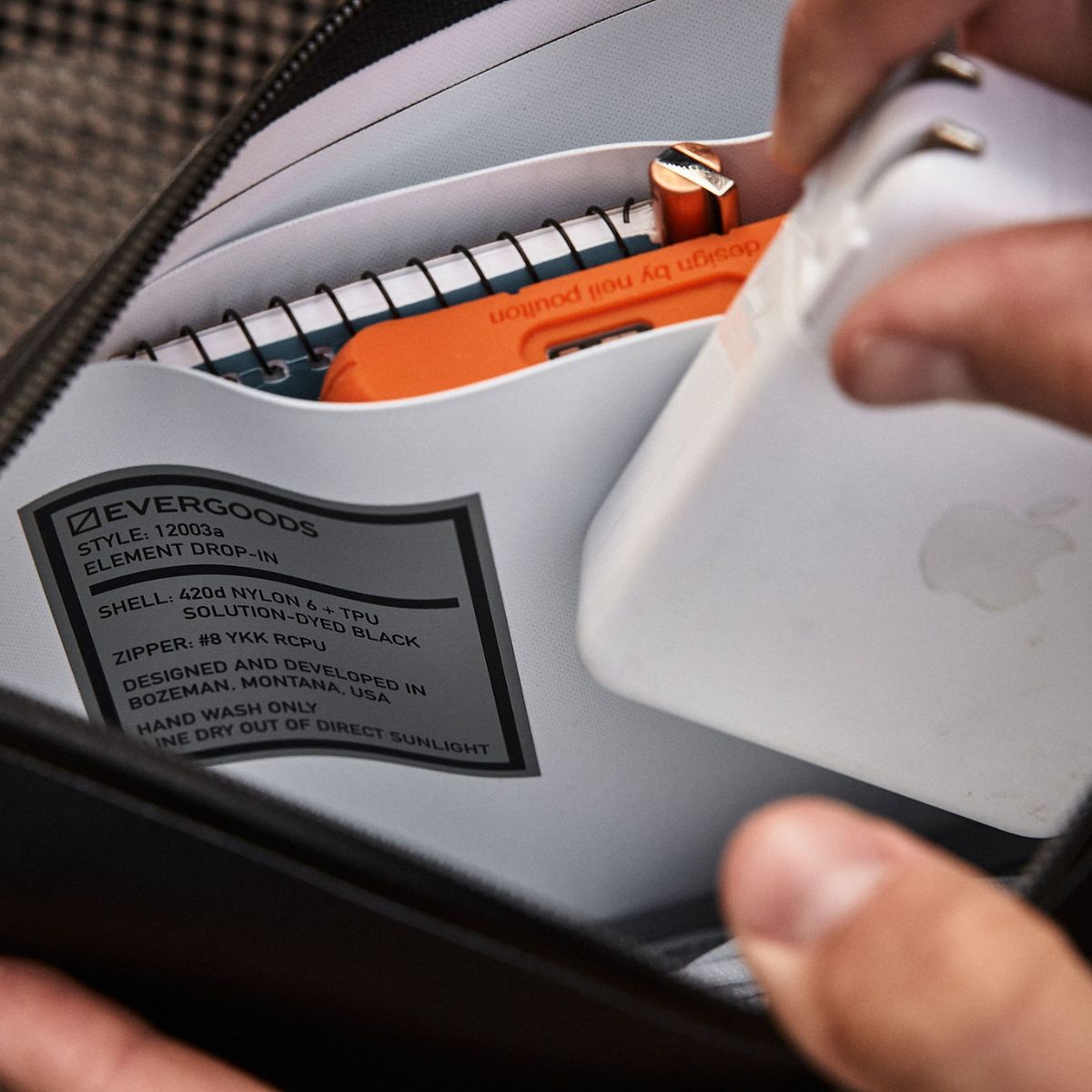 Minimalist yet substantial, utilitarian but still elegant; the ELEMENT Drop In is an essential weatherproof tool in your carry arsenal. Backed by 3+ years of internal R&D efforts, EDI is constructed using radio frequency welding and flat bonding techniques. This is made possible by a custom-developed solution-dyed black textile with a TPU laminate and kiss-coated face. Despite its slim appearance, our signature 3D patterning, mobile dividers, and drop-in slots allow EDI to flex to hold a myriad of everyday and travel loadouts: travel essentials to tech items to even camera kits.