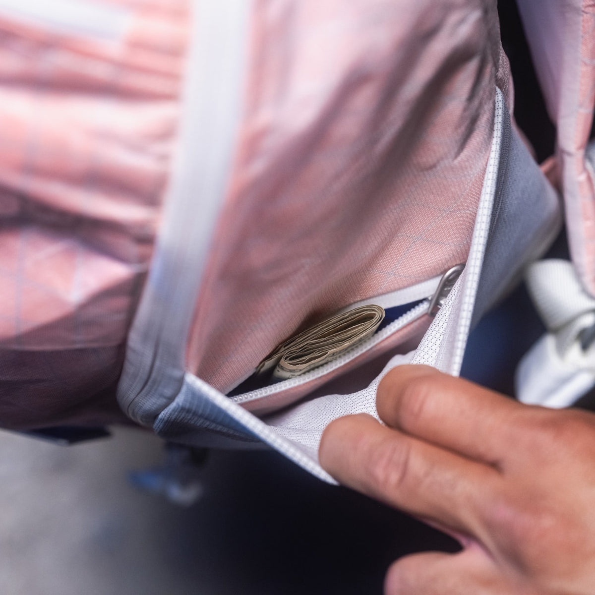 On both sides of MPL22, just below the elastic line of the water bottle pockets, lies a (shh) hidden stash pocket sized for small items like AirTags, cash, or a USB. Each stash pocket offers a secret contrast "pop" lining color of Blue Flame or Electric Coral.