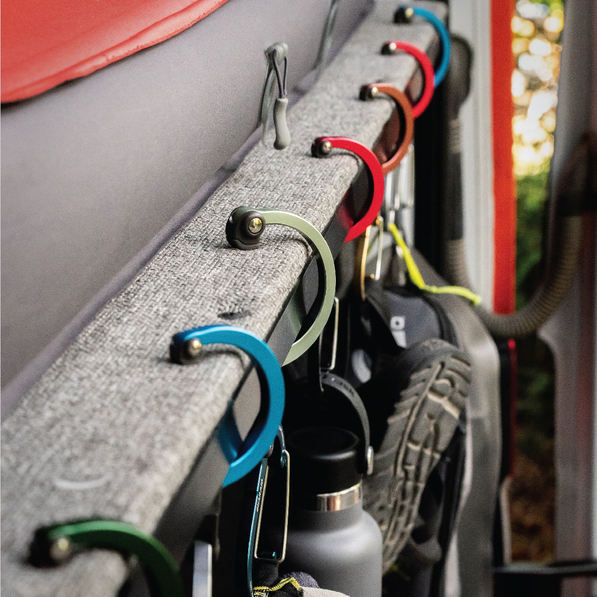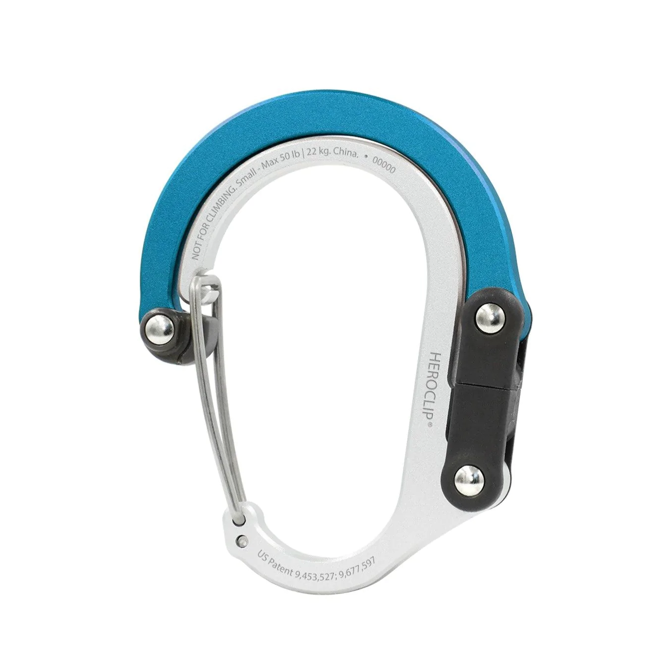 Our tiny but mighty Heroclip Mini gear clip lets you hook and hang small items, such as lights from a tent or a tree branch, bags and toiletry kits from towel racks, or tiny speakers from a wire shelf. This versatile gear clip hangs securely, rotates 360°, and folds compactly in ways other carabiners, clips and hooks can’t, helping you keep your gear organized and exactly where you want it, no matter the activity. The clip also features a wider clip gate compared to standard carabiners and clips, and a hook with a grippy rubber tip.