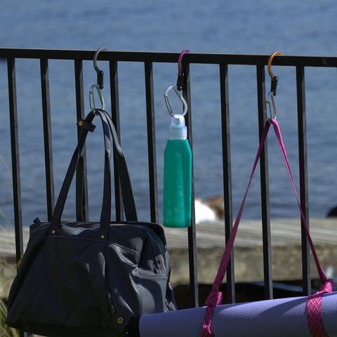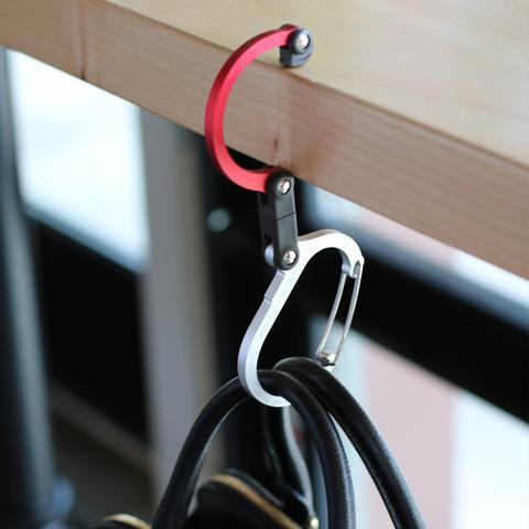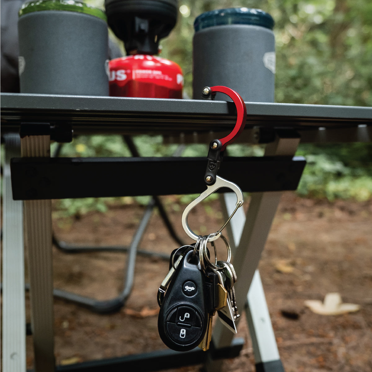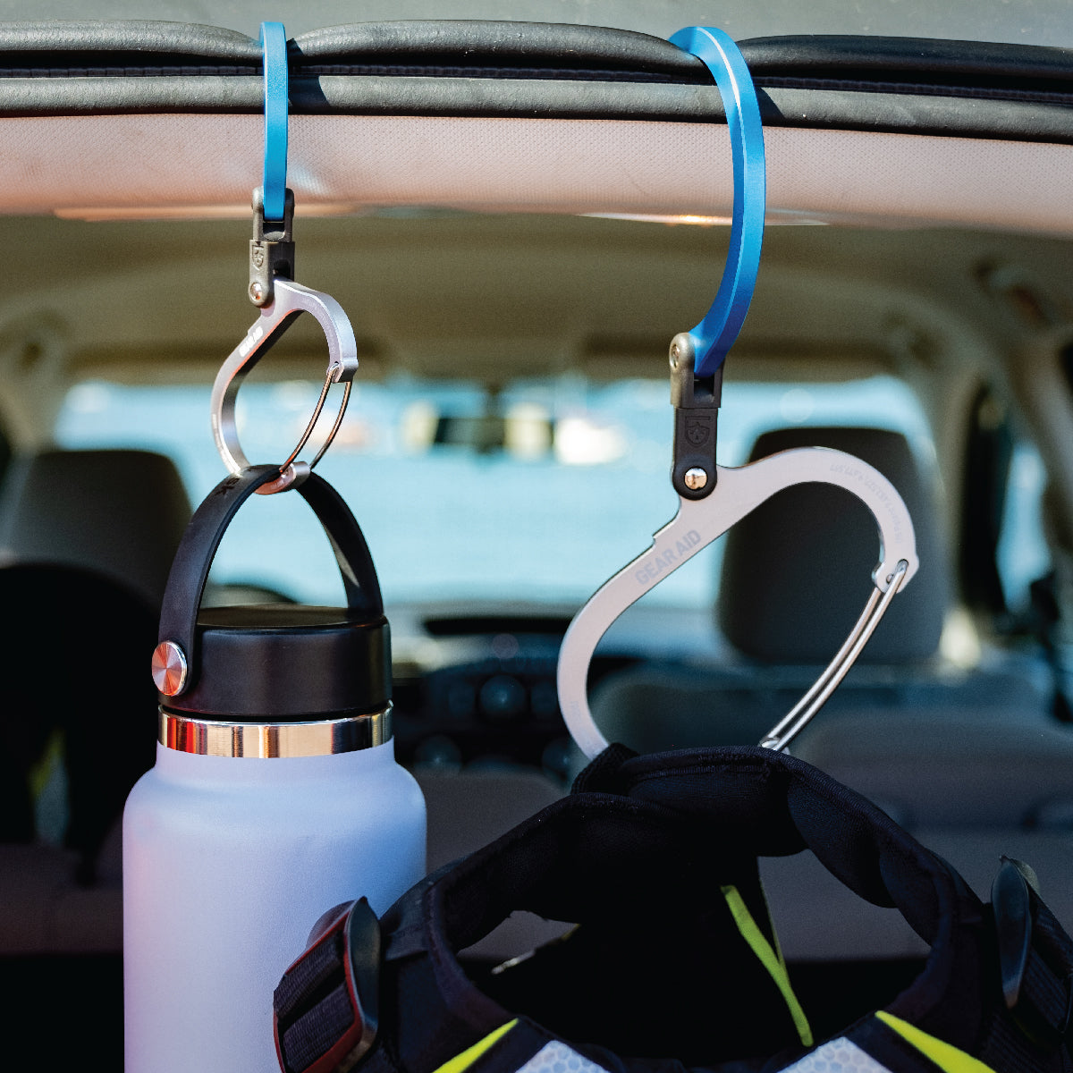 Heroclip Small gear clip lets you hook and hang water bottles at the campsite, and backpacks from shelves, counters, tables, chairs, or even doors. They’re also great for hanging gravity filters from tree branches, tools from ladders, or carry-on bags from roller suitcase handles. This versatile gear clip hangs securely, rotates 360°, and folds compactly in ways other carabiners, clips and hooks can’t, helping you keep your gear organized and exactly where you want it, no matter the activity. The clip also features a wider clip gate compared to standard carabiners and hooks, and a hook with a grippy rubber tip for hanging things from flat surfaces.