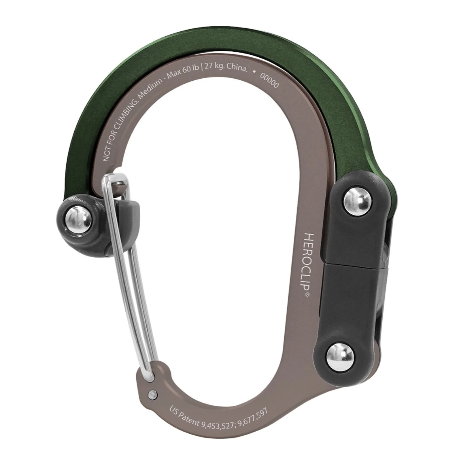 Heroclip Medium gear clip lets you hook and hang big backpacks from trees, duffle bags from fences, buckets from ladders, and dromedary bags at camp. This versatile gear clip hangs securely, rotates 360°, and folds compactly in ways other carabiners, clips and hooks can’t, helping you keep your gear organized and exactly where you want it, no matter the activity. The clip also features a wider clip gate compared to standard carabiners and hooks, and a hook with a grippy rubber tip for hanging things from flat surfaces.
