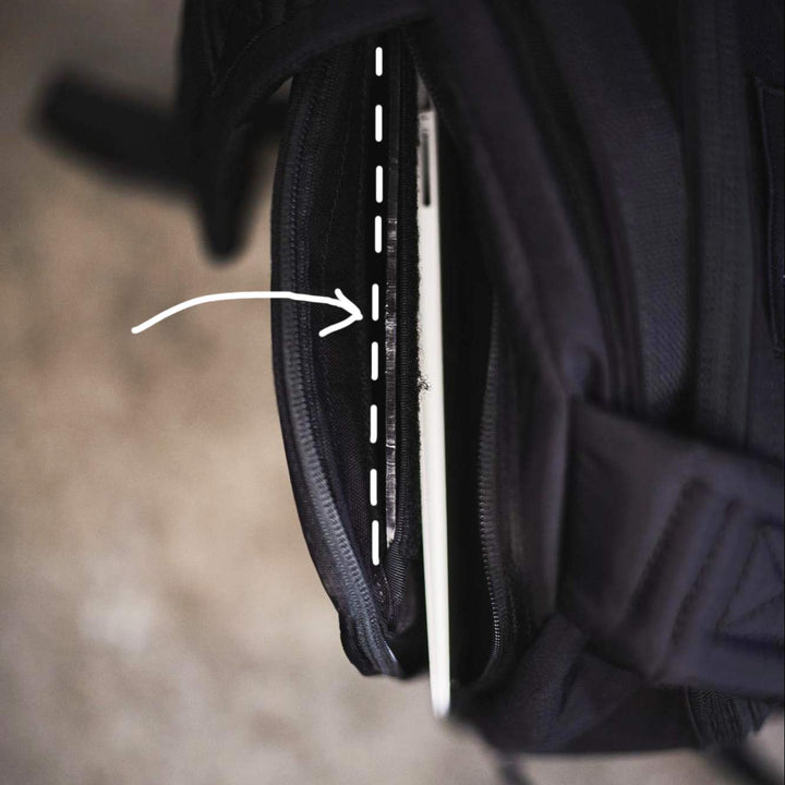 The separate compartment next to your back is extra reinforced to securely take a laptop into combat. Fits 13" Macbook Pro or Air comfortably and most 14" laptops.