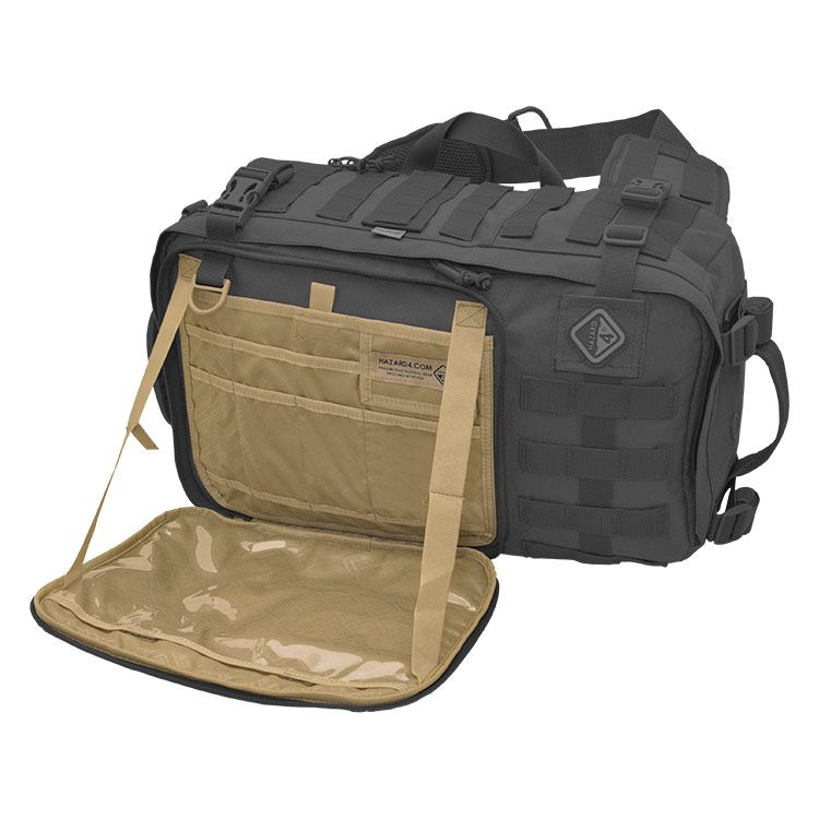 This unique pro-quality sling-pack has generous size to accommodate laptops in its padded retainer, yet is nimble enough to be rotated from back to chest. Common to all our slings, such as the Evac™ series, this maneuver gives on-the-go access to frequently used gear while carrying heavier loads on the back the rest of the time. It's also more secure in crowds etc., since you can keep it in sight and allows users to sit back in tight quarters such as ski lifts, or in vehicle interiors etc. The generously padded and ventilated main shoulder strap is also ergonomically cut for hours of comfortable wear per day, and it is covered in modular (MOLLE compatible) webbing to attach pouches for phones etc. at hand's reach. Generous side modular webbing provides lots of expansion options and the thermoformed best-in-class moulded back panel provides variable rigidity, air ventilation, and a durable surface. A drop-down fast access gear organizer can also hold an iPad® sized tablet like a shelf and the main compartment is lined in velcro like fuzz for attaching dividers, patches or Hazard 4® holsters. An included but removable stabilizer strap keeps the bag from sliding forward when leaning (like on a bike). Wherever and however hard core your work or play, the Sidewinder's got your back, and your front.