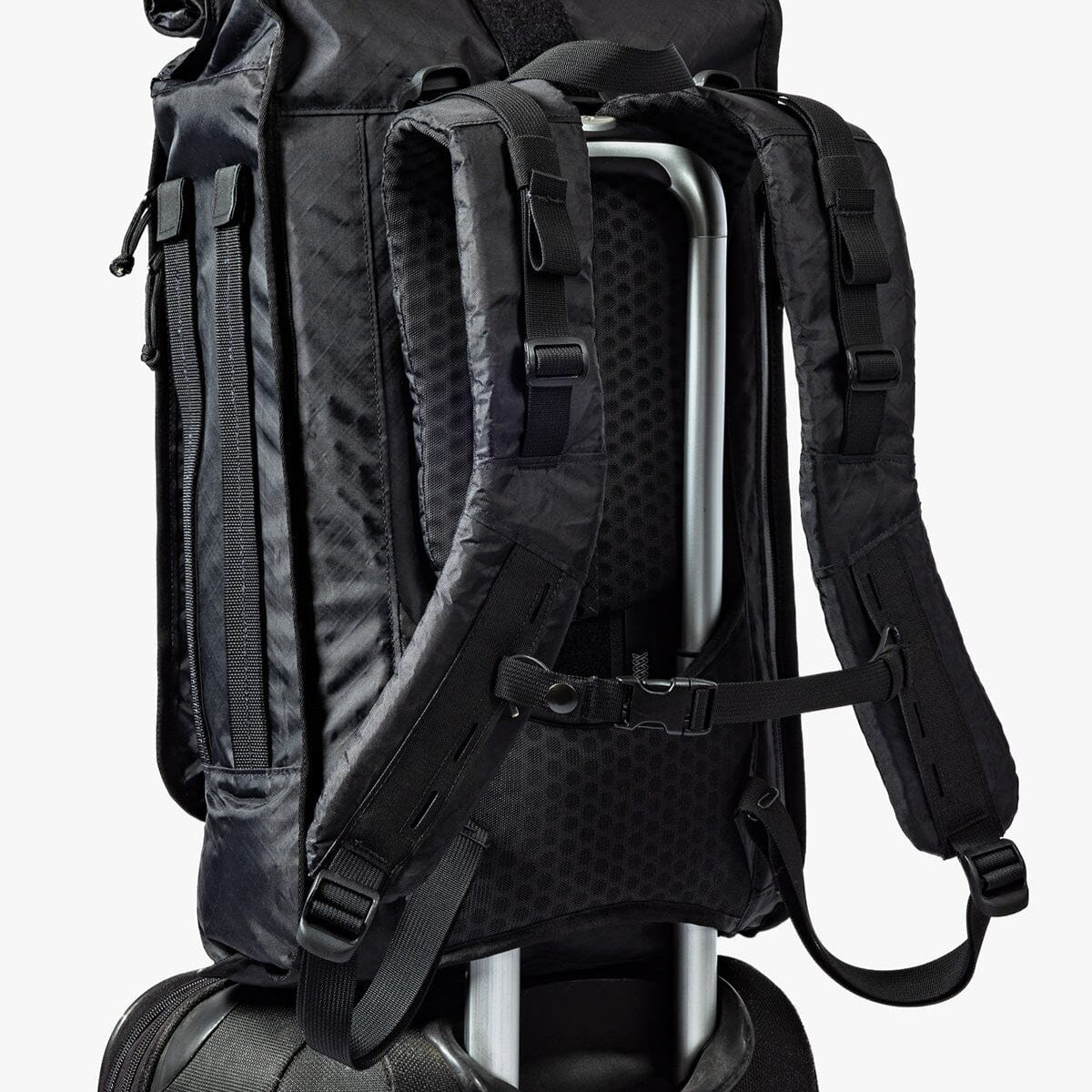 The lumbar pad creates a heavy-duty luggage handle pass through that allows the pack to remain in a vertical orientation when paired with rolling luggage.