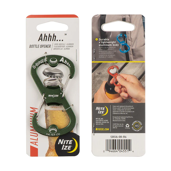 Like our classic S-Biner, both ends of the S-Biner Ahhh feature sturdy gate closures, making it a multifunctional carabiner that you can use to attach and carry keys, water bottles, and camping gear; hang lanterns and lights; or clip two items together. But we didn't name this little puppy the "Ahhh" for nothing - both ends function as bottle openers, too. That means that when you carry the S-Biner Ahhh wherever you go, you'll always be able to pop open a bottle of your favorite beverage, making you the envy of thirsty people everywhere.