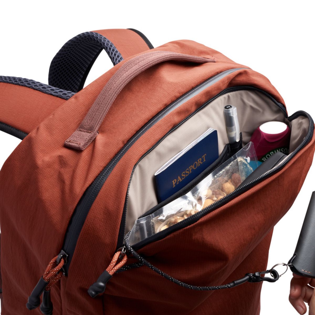 The handy top pocket has internal organization for your passport, pens, keys and personal effects, while the lower pocket has space for a jacket or light sweater.