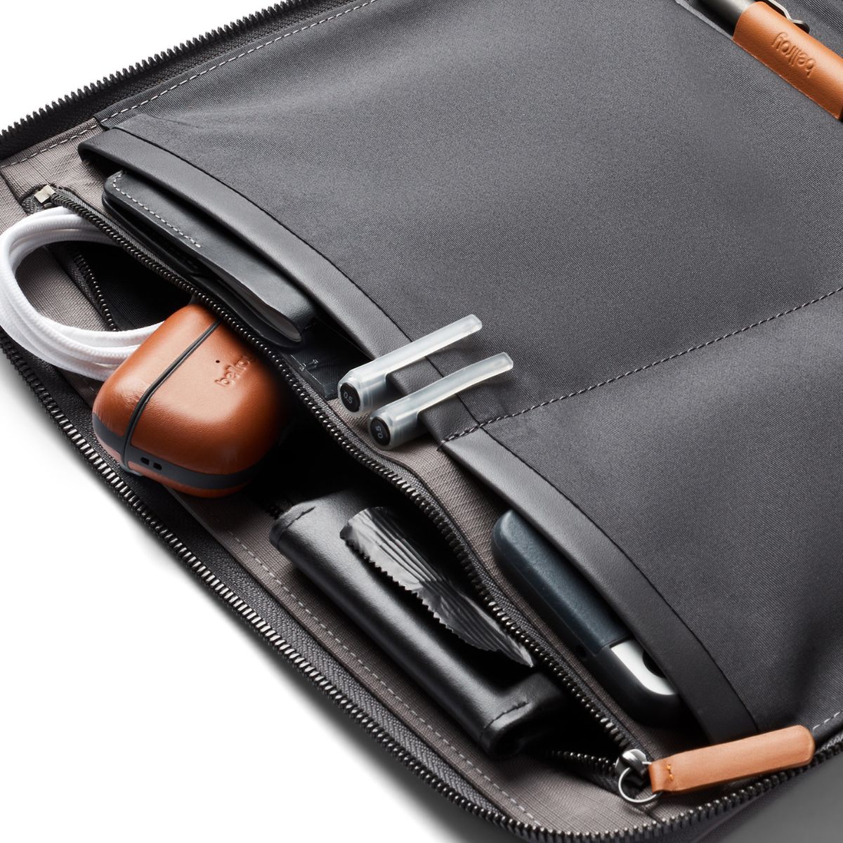 iPad protected in the padded sleeve. Notebook secured in the slip. Chargers, cables, earbuds and more sorted and stowed in the pockets. And extra bits zipped securely inside.