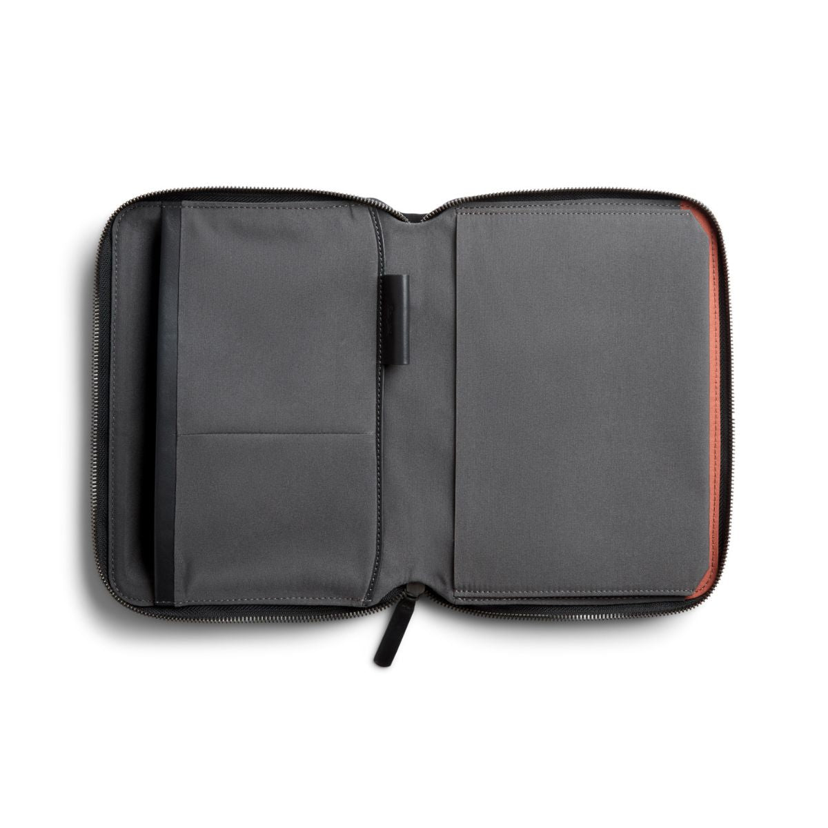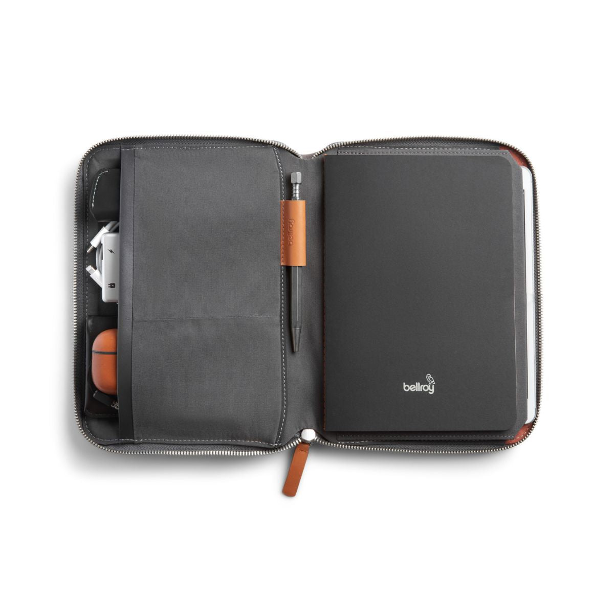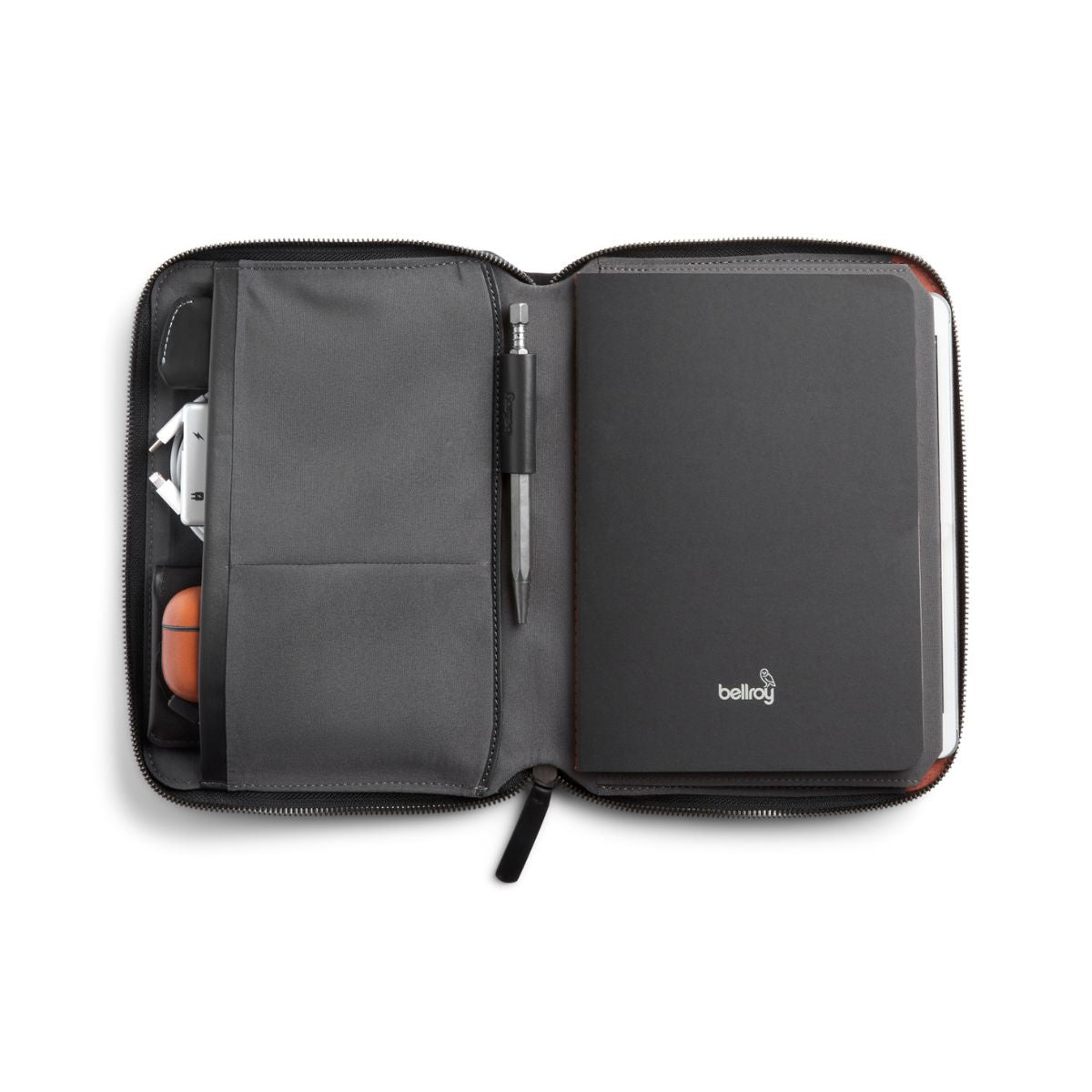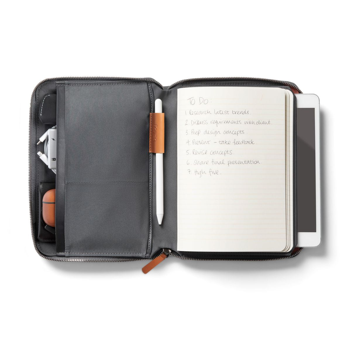 Two sleeves secure your tablet and a notebook. Internal pockets sort your earbuds and small stuff. Your pen goes in the loop, and your phone and wallet slide in the rear zip pocket.