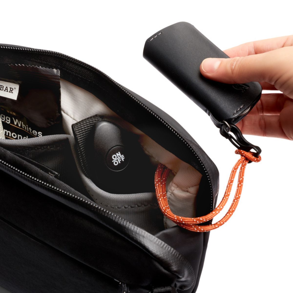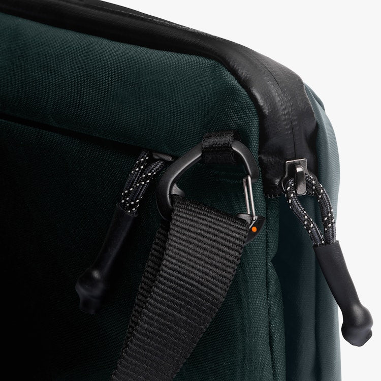 Custom metal carabiners let you easily attach and remove the strap. So you can go from pouch to bag and back again, depending on where you’re headed.