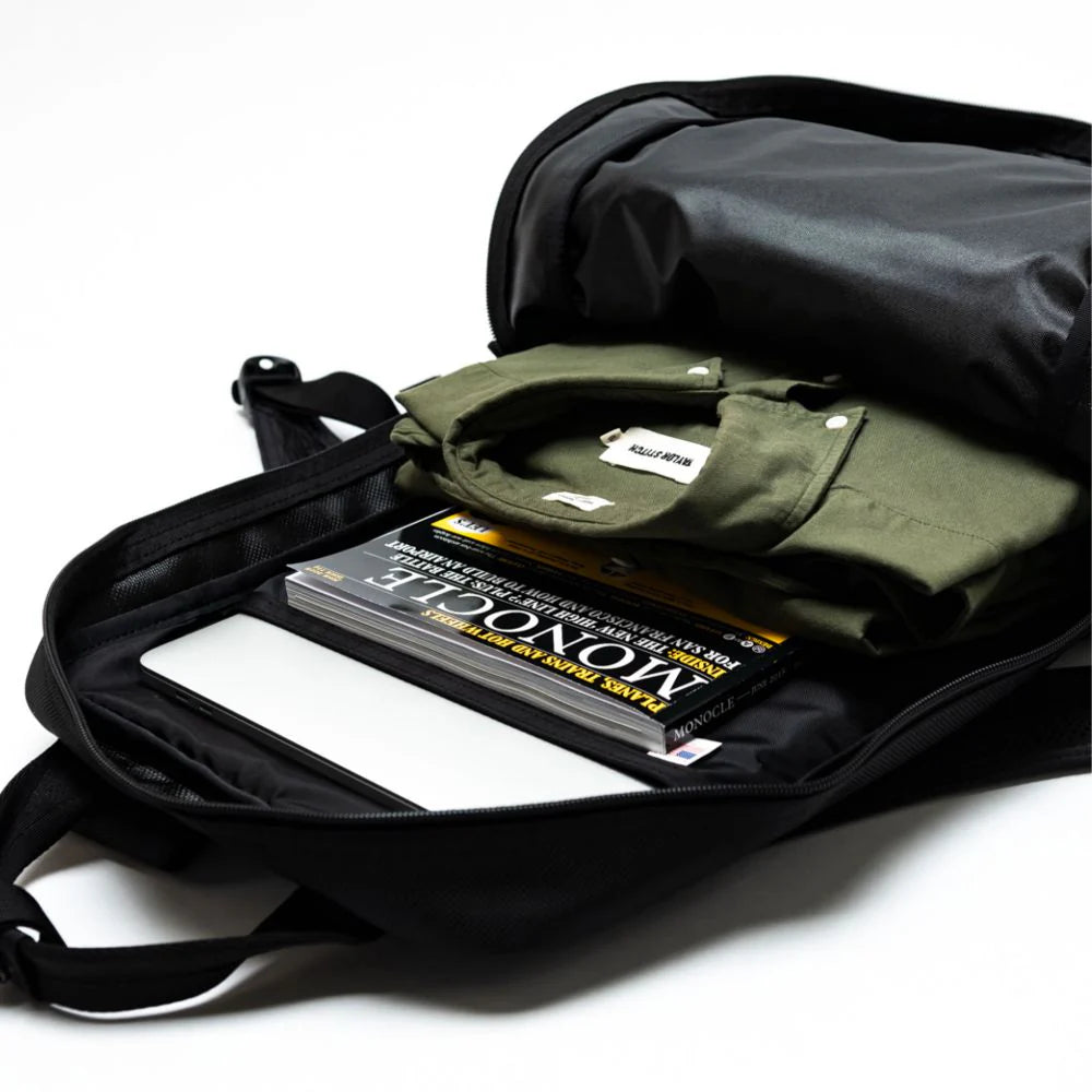 A square-shaped backpack suitable for a variety of occasions. The front compartment is equipped with small and large pockets that are convenient for storing small items. The back compartment is spacious, simple and easy to use, and provides plenty of storage space. On the exterior, there is a large pocket for storing small items. There is also a detachable key holder inside the pocket to keep your keys handy. The bag is made of 1050 denier ballistic nylon. It also features the iconic red stitching of Briefing.