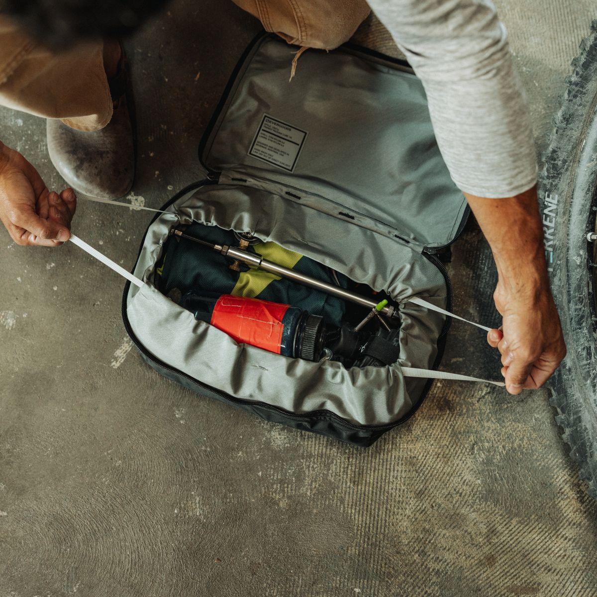 Integrated in the containment collar is a two-way cinch cord that cinches and compresses your load, which allows you to overstuff TPC10. The main zipper line also mechanically compresses your load when closing the cube.