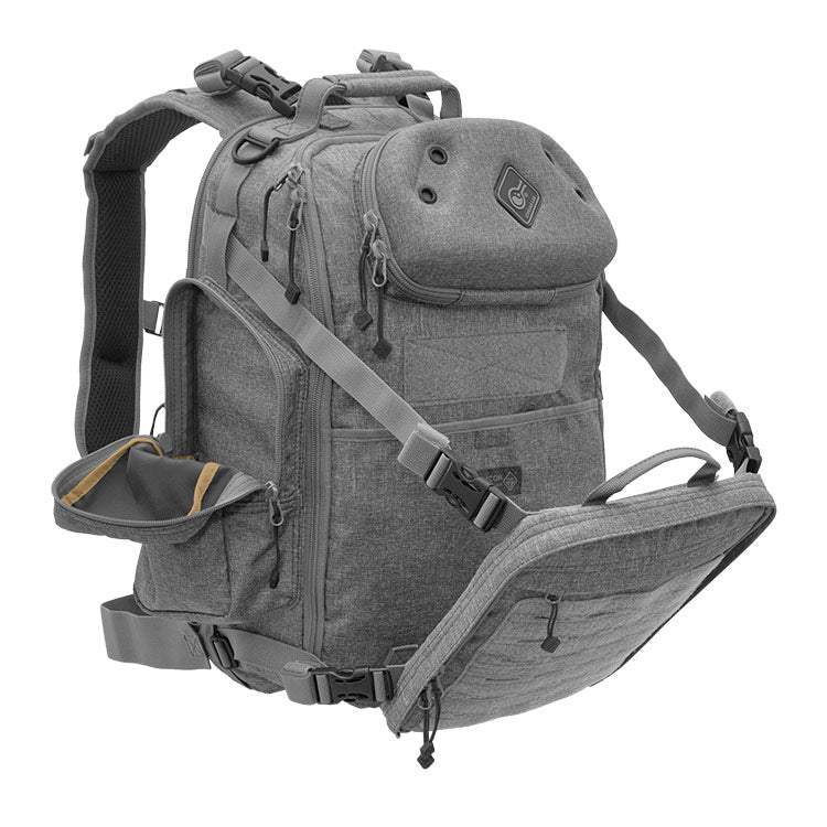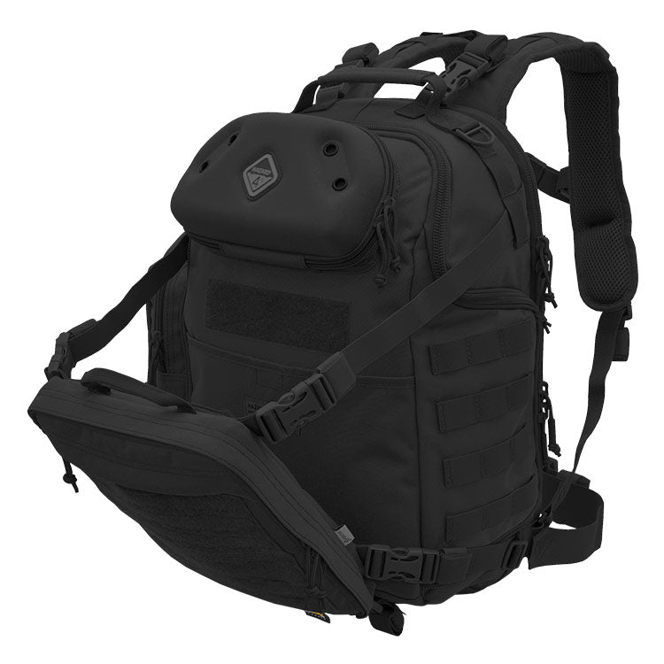 This is Hazard 4®'s first daypack with an external load-carrier 'beavertail' for helmets, jackets, etc. The carrier can flip 180° down to manage long loads like rifles, and the bottom hinges allow detaching & expanding. Drawbridge has a unique top, perimeter, or side sling-style zipper access choice, and the load carrier has an admin area. There's a molded top-shell to protect optics, and other breakables, and is also a base for our exclusive HardPoint® hardware parts. A large zip pocket on the side fits Nalgene bottles, radios, etc., and a padded laptop/hydration area in soft molded back panel can fit laptops up to 17". The back panel adds structure, back safety & air circulation, and also has a removable luggage trolly-handle strap. When this luggage strap is off, loops are left for carabiners, etc. Drawbridge comes with our removable, minimal waist belt w/ patented roto-lock buckle, and fuzzy liner on inner walls for optional dividers/photo bin inserts. Side compression straps can hold objects to pack’s sides, and there's a large flat pocket under carrier & on pack-back. Other features include: supersized laser-cut MOLLE & velcro i.d. patch panel, MOLLE loops on 3 sides & harness for pouches, etc., and sternum strap with elastic auto-adjust, 2-position belt height.