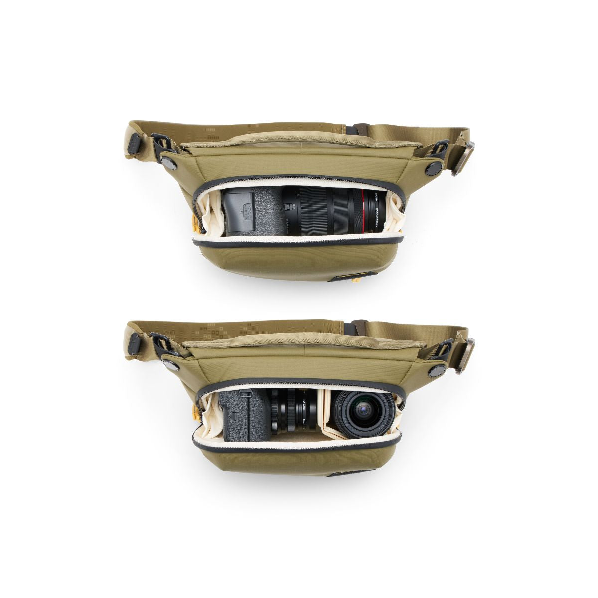 The ideal minimalist 1-camera bag. Great for a single body+lens and a few accessories. Also ideal for essential everyday or travel carry. A sling that's also wearable as a hip bag.