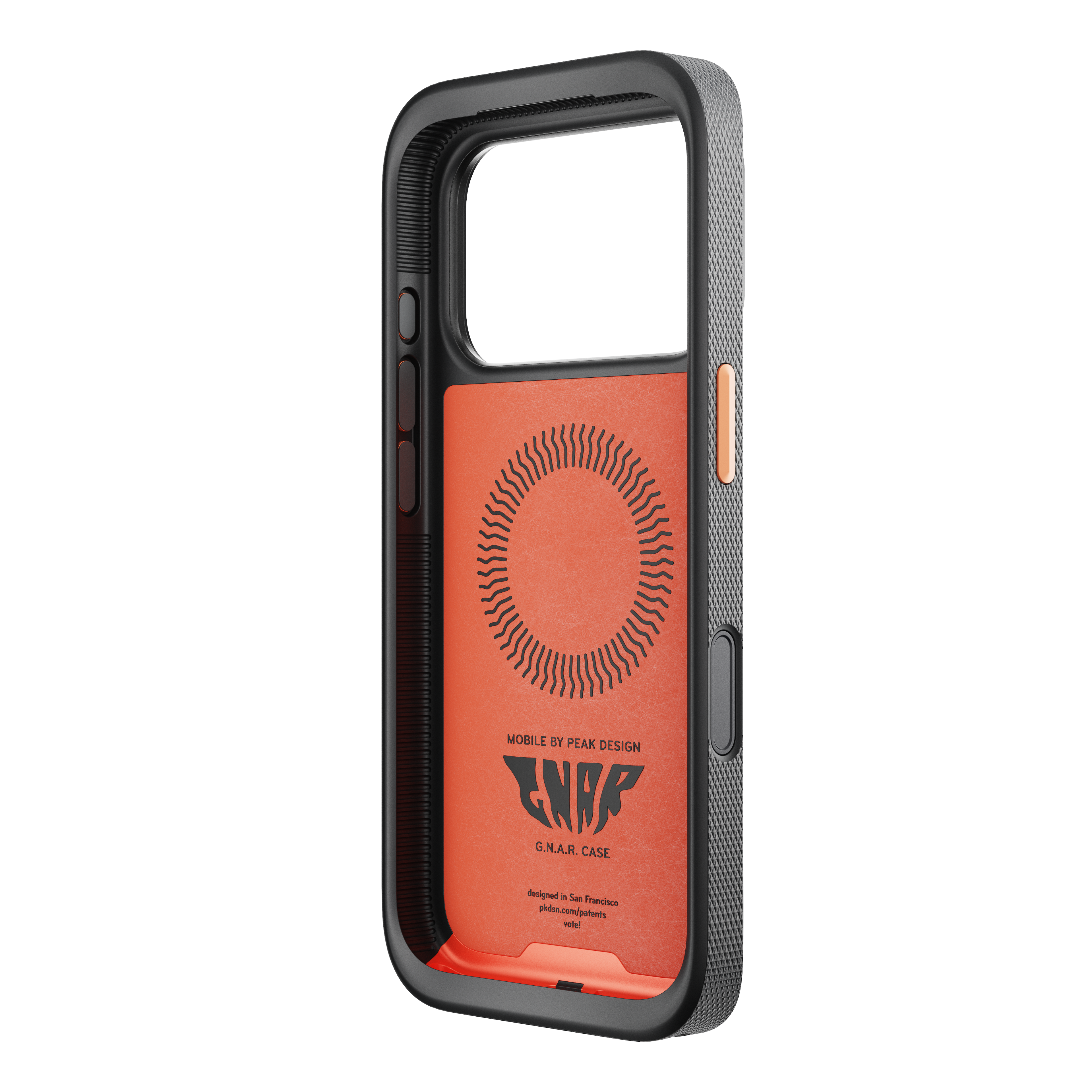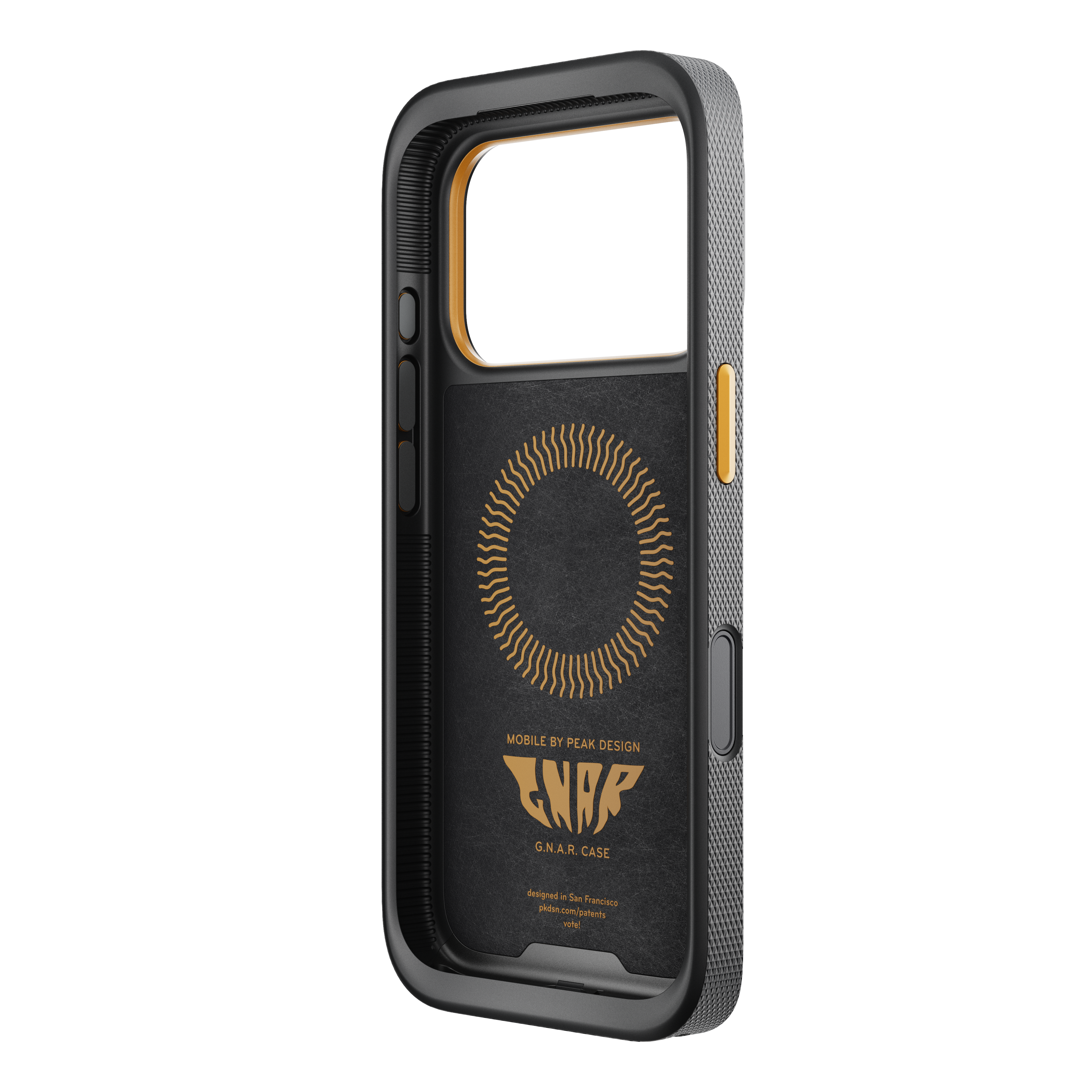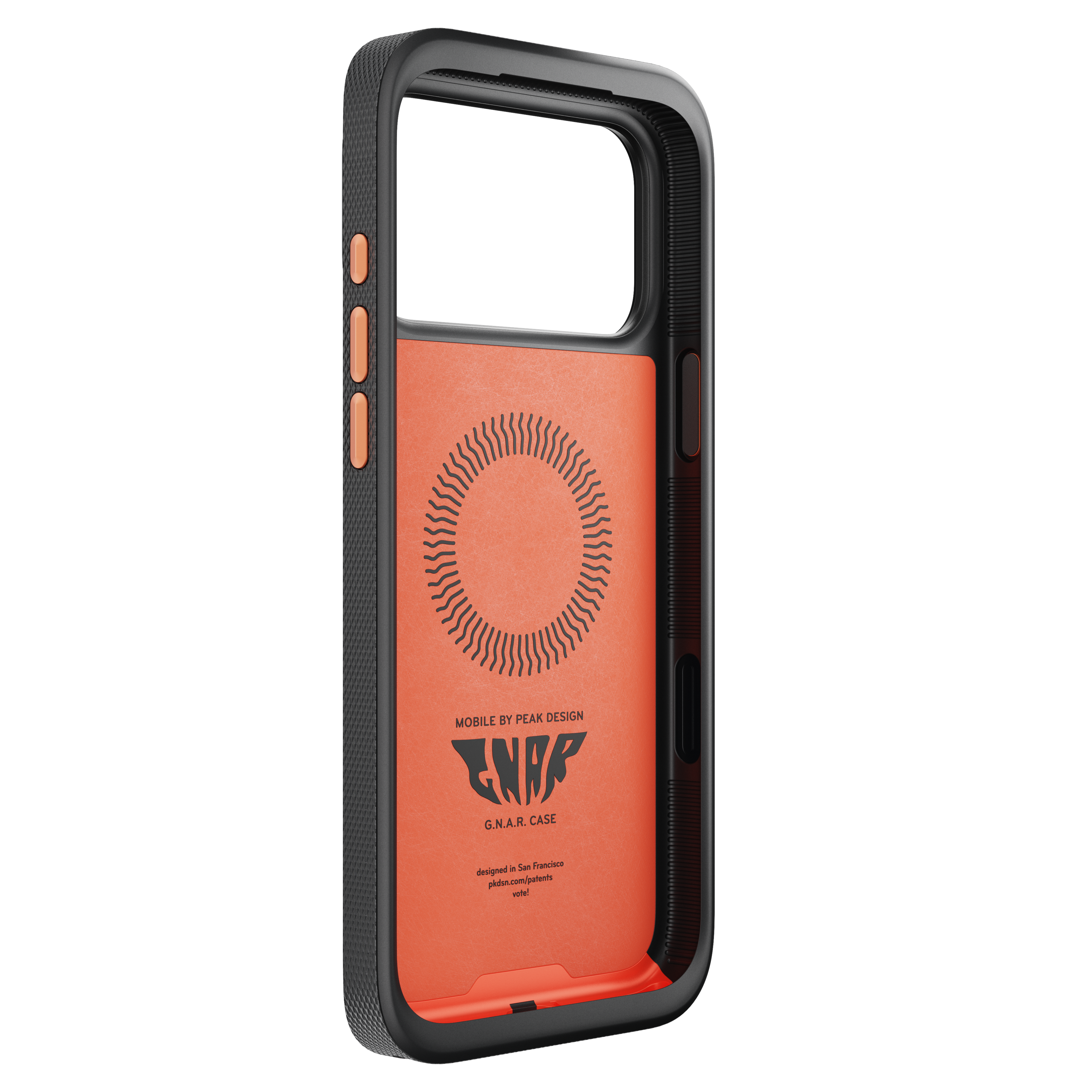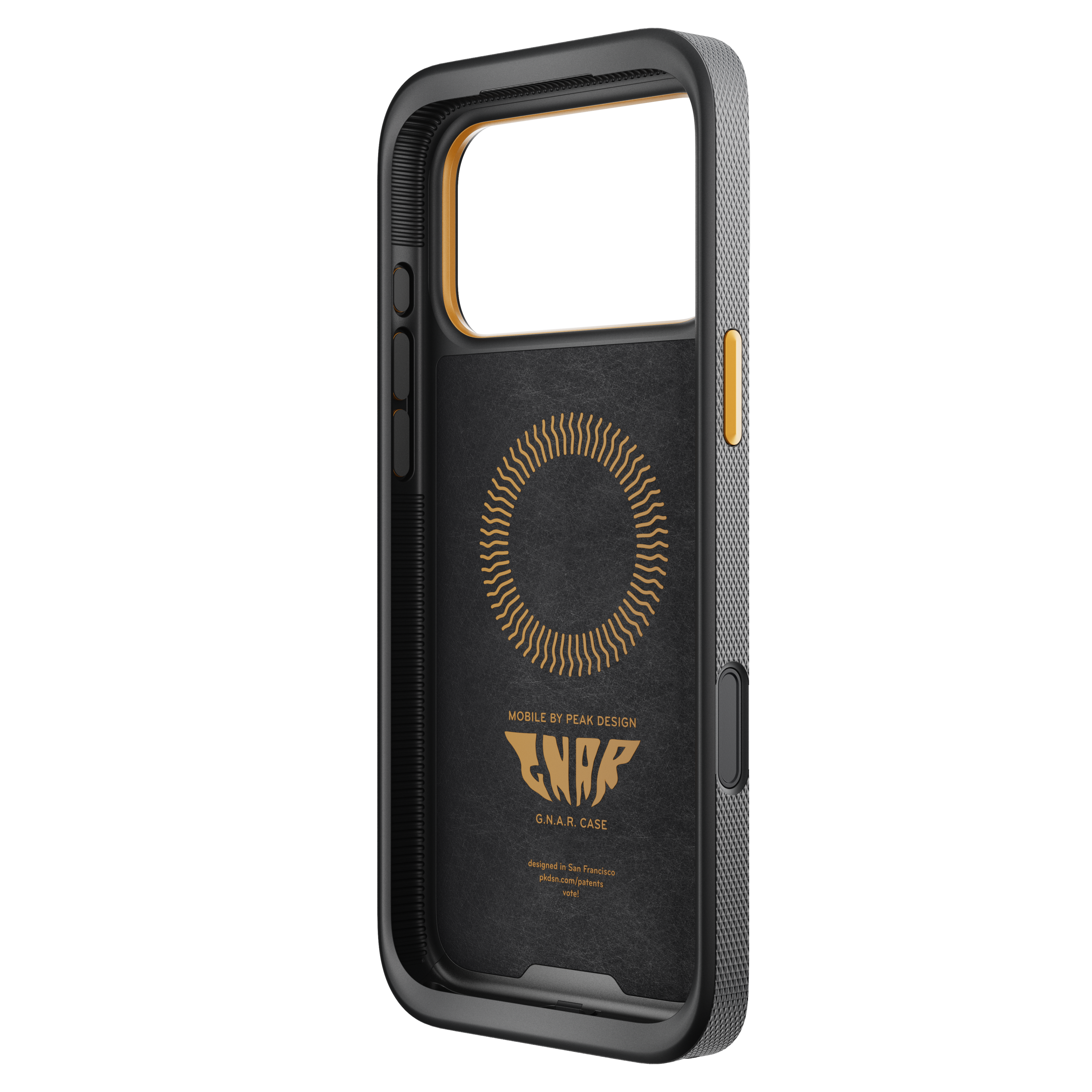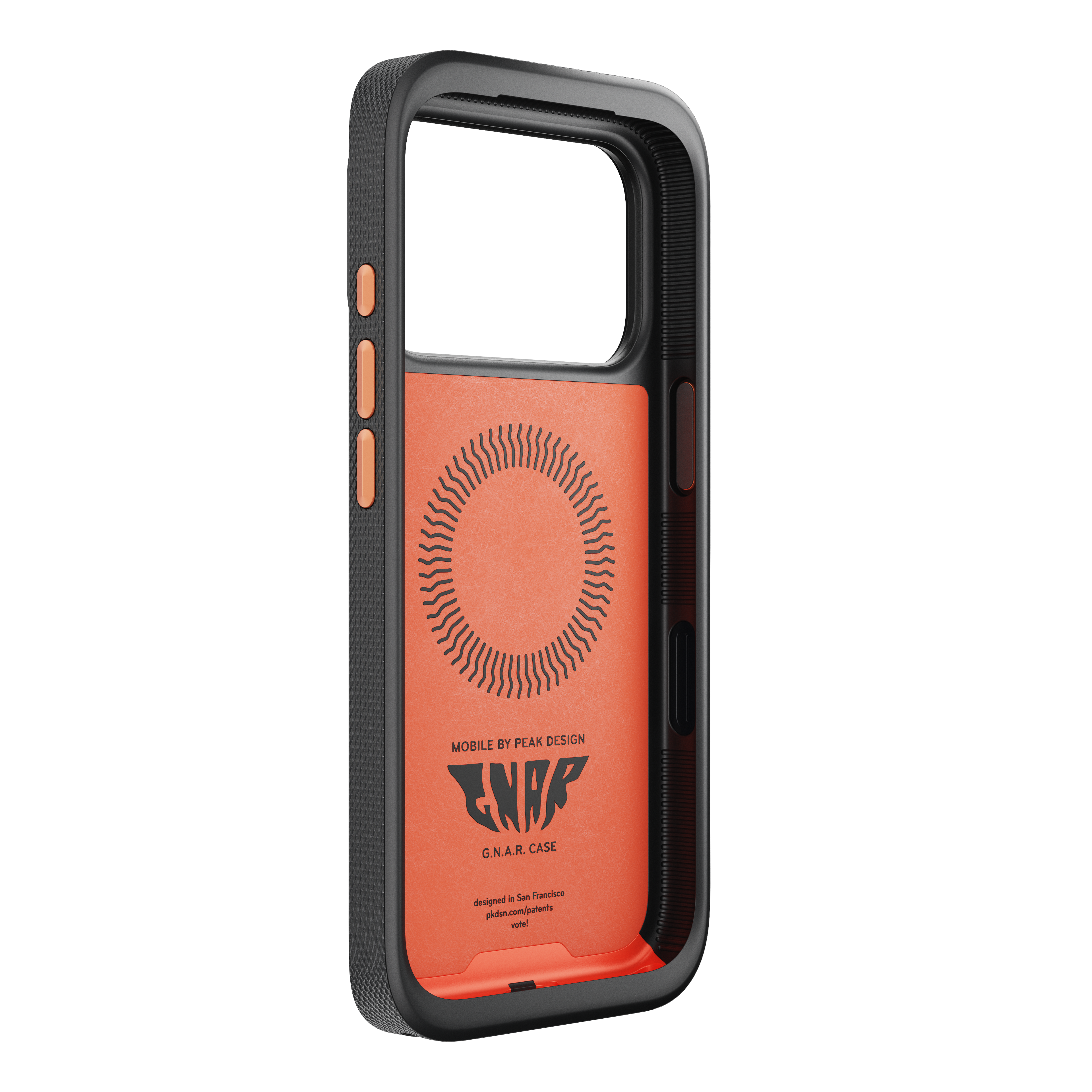 All the protection, ruggedness, and connect-ability that you could ever want from a phone case, yet with a clean and refined aesthetic, the iPhone 17 GNAR case is among our first generation of cases to be Fair Trade Certified. Designed for those individuals who are 'down to clown' but don't want to look like one, GNAR Case is ideal for motorcycling, mountain biking, and the security-loving 'belt-and-suspenders' types. Compared to the Everyday Case, it has a bit more padding—3.2mm thick (vs. 2.4mm), 4.4mm TPU bumper (vs. 3.4mm), raised camera bezel—yet retains a flat, slim profile that feels svelte in your hand and your pocket. A lightweight recycled polycarbonate body features a smooth scratch-and-stain-resistant finish that's easy to clean. A diamond-knurled edge texture and extra-wide machined/anodized aluminum buttons make GNAR Case easy to handle, even with gloves on. A soft Clarino™ microfiber internal liner keeps your phone pristine, and a removeable USB-C port plug prevents dirt and water ingress in outdoor environments. And of course, it contains our brilliant magnetic/mechanical SlimLink™ locking system for instant connection to all Peak Design Mobile mounts, chargers, and accessories. We designed GNAR Case for ultra reliable lightning-fast wireless charging, which can be an issue with some thicker 3rd party cases. It even works with Apple MagSafe chargers and accessories, however compatibility with all 3rd party chargers is not guaranteed.