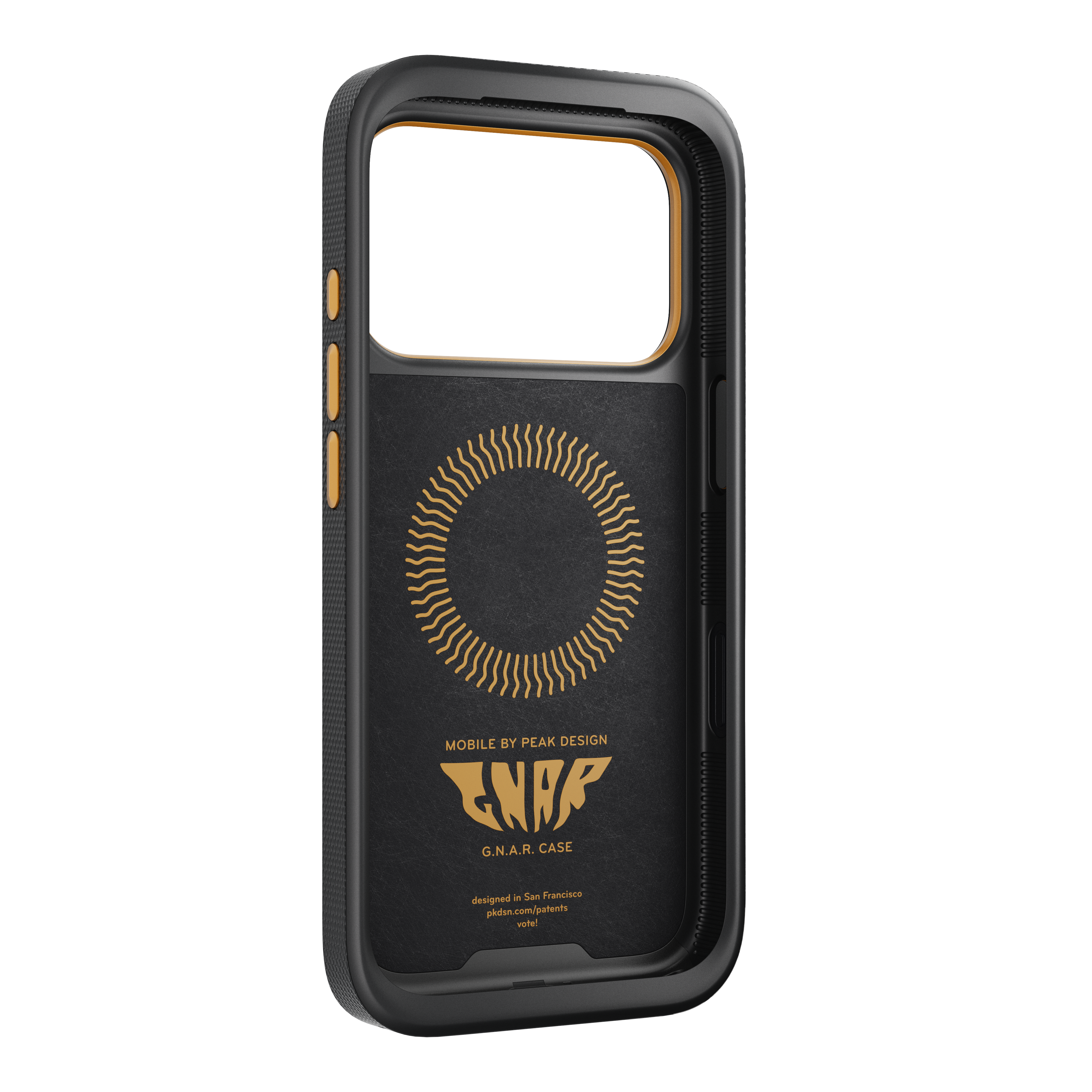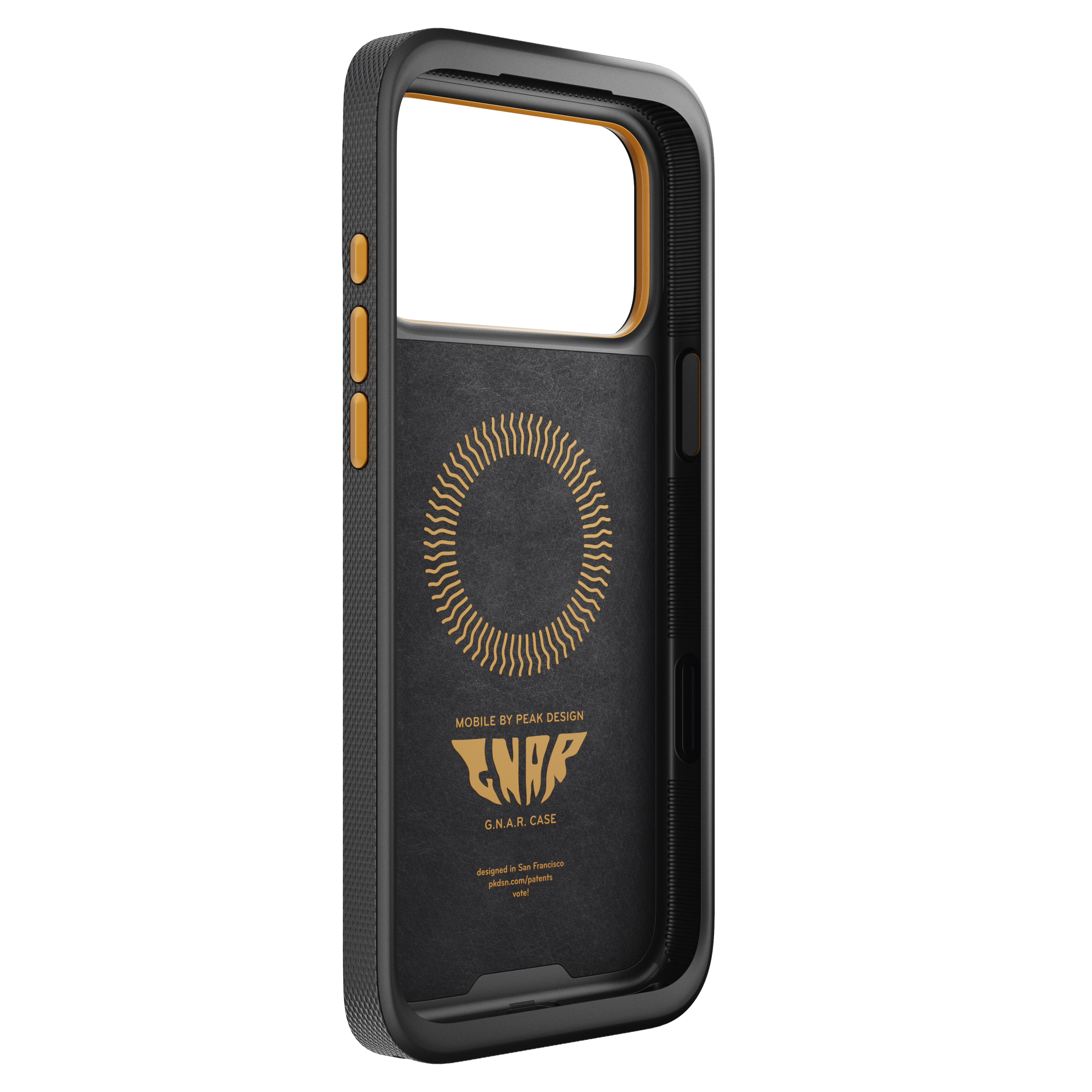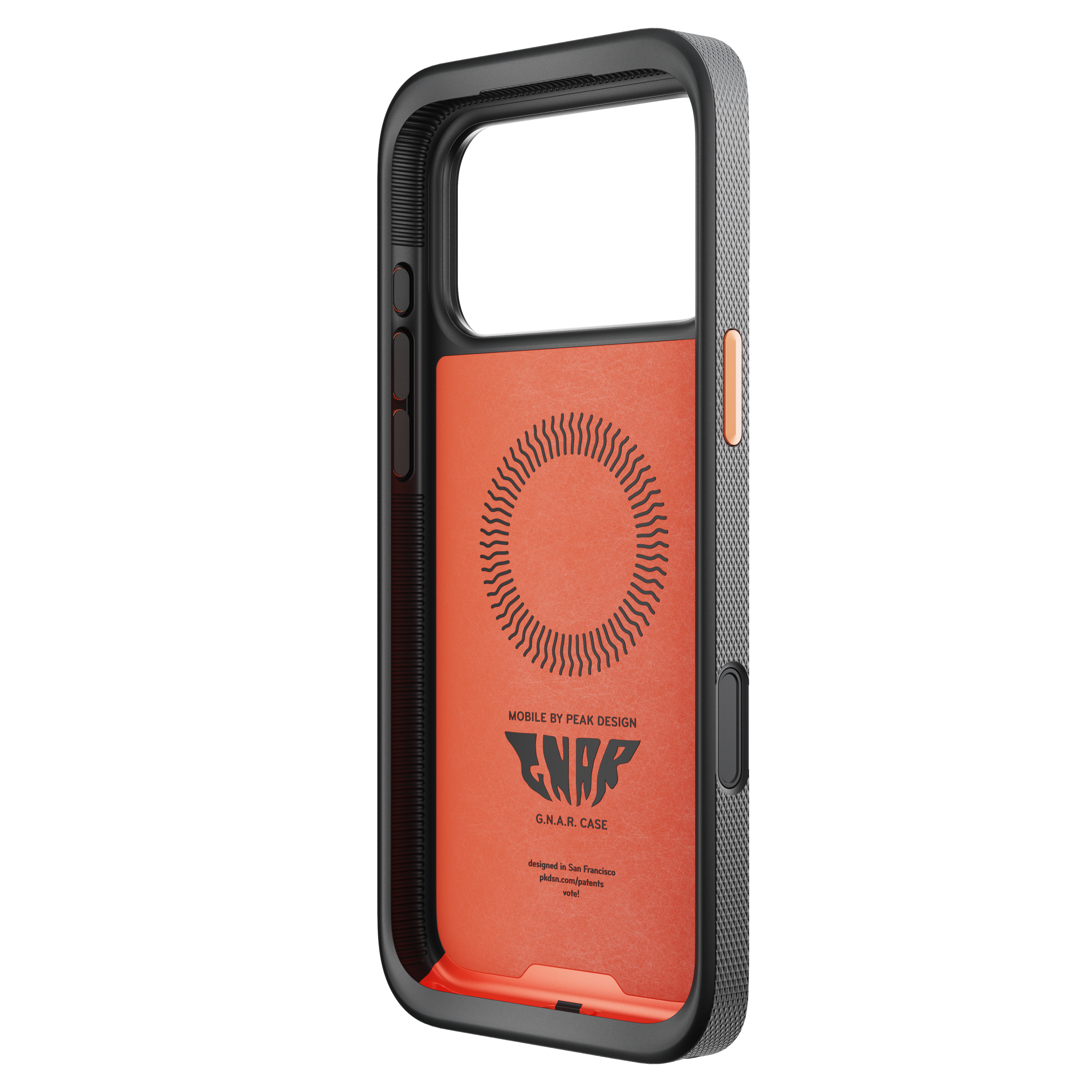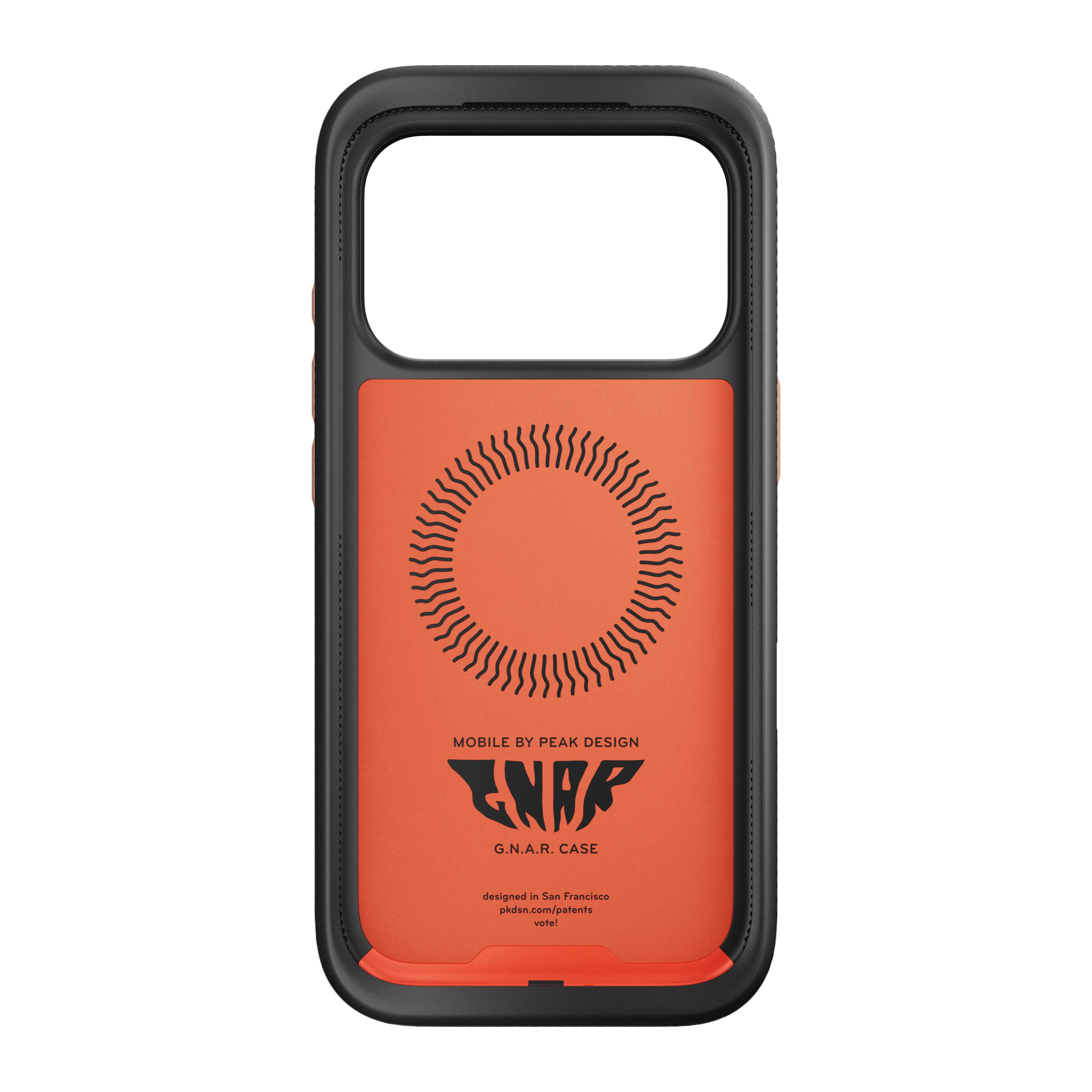 All the protection, ruggedness, and connect-ability that you could ever want from a phone case, yet with a clean and refined aesthetic, the iPhone 17 GNAR case is among our first generation of cases to be Fair Trade Certified. Designed for those individuals who are 'down to clown' but don't want to look like one, GNAR Case is ideal for motorcycling, mountain biking, and the security-loving 'belt-and-suspenders' types. Compared to the Everyday Case, it has a bit more padding—3.2mm thick (vs. 2.4mm), 4.4mm TPU bumper (vs. 3.4mm), raised camera bezel—yet retains a flat, slim profile that feels svelte in your hand and your pocket. A lightweight recycled polycarbonate body features a smooth scratch-and-stain-resistant finish that's easy to clean. A diamond-knurled edge texture and extra-wide machined/anodized aluminum buttons make GNAR Case easy to handle, even with gloves on. A soft Clarino™ microfiber internal liner keeps your phone pristine, and a removeable USB-C port plug prevents dirt and water ingress in outdoor environments. And of course, it contains our brilliant magnetic/mechanical SlimLink™ locking system for instant connection to all Peak Design Mobile mounts, chargers, and accessories. We designed GNAR Case for ultra reliable lightning-fast wireless charging, which can be an issue with some thicker 3rd party cases. It even works with Apple MagSafe chargers and accessories, however compatibility with all 3rd party chargers is not guaranteed.