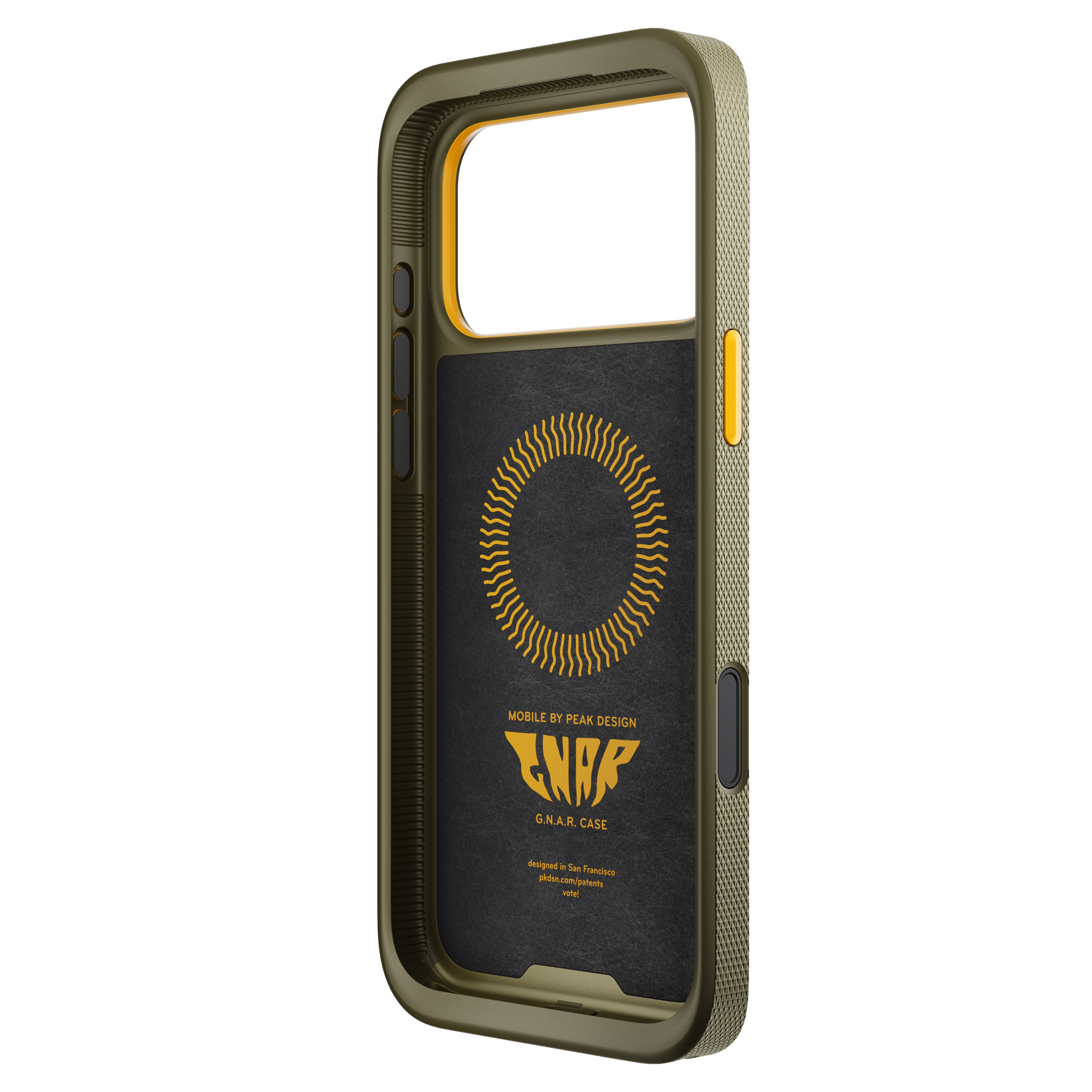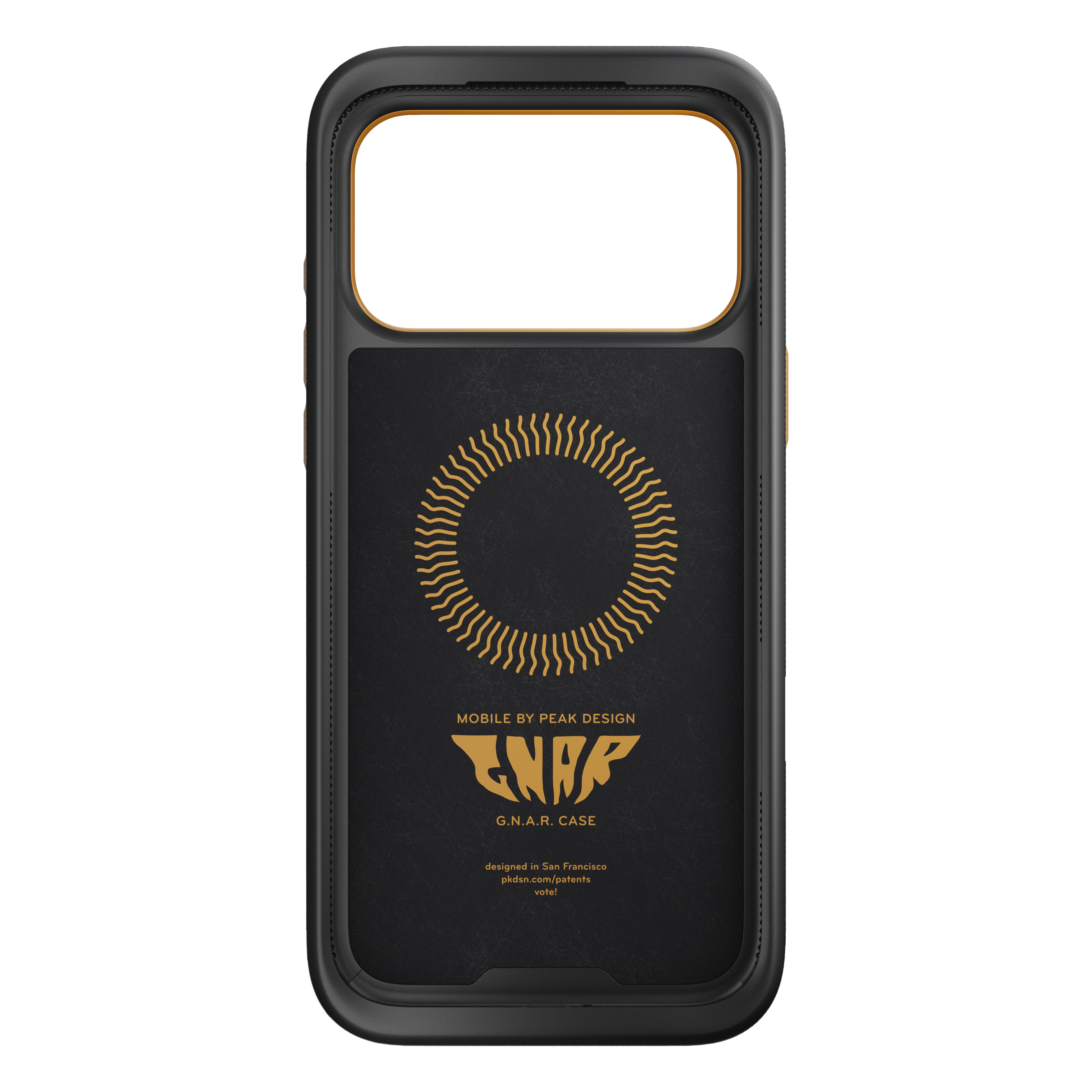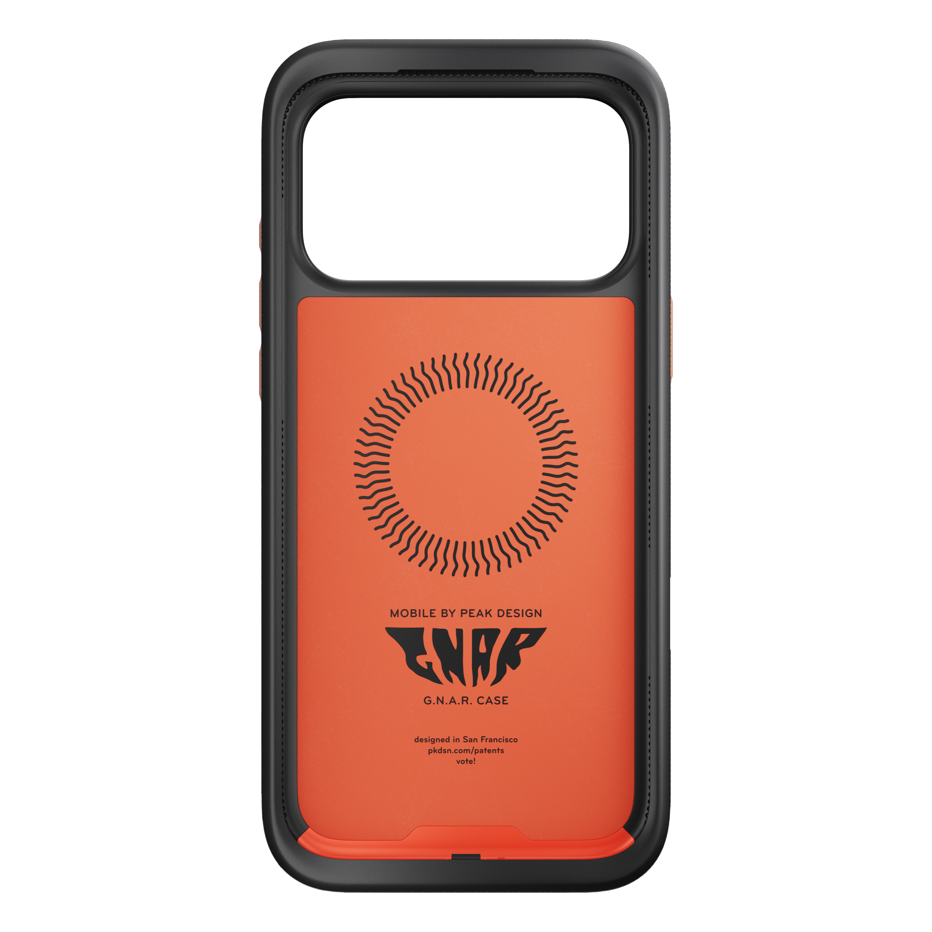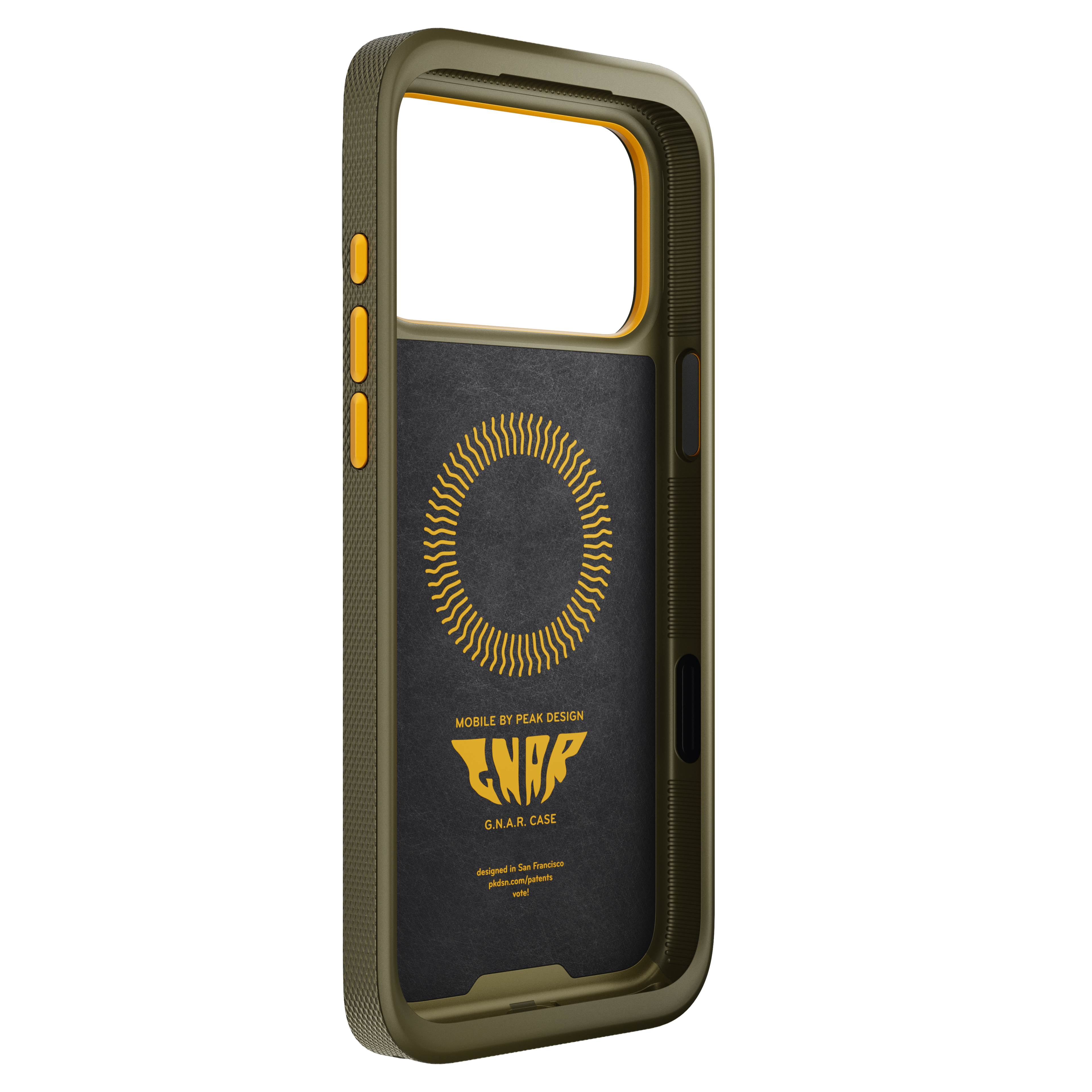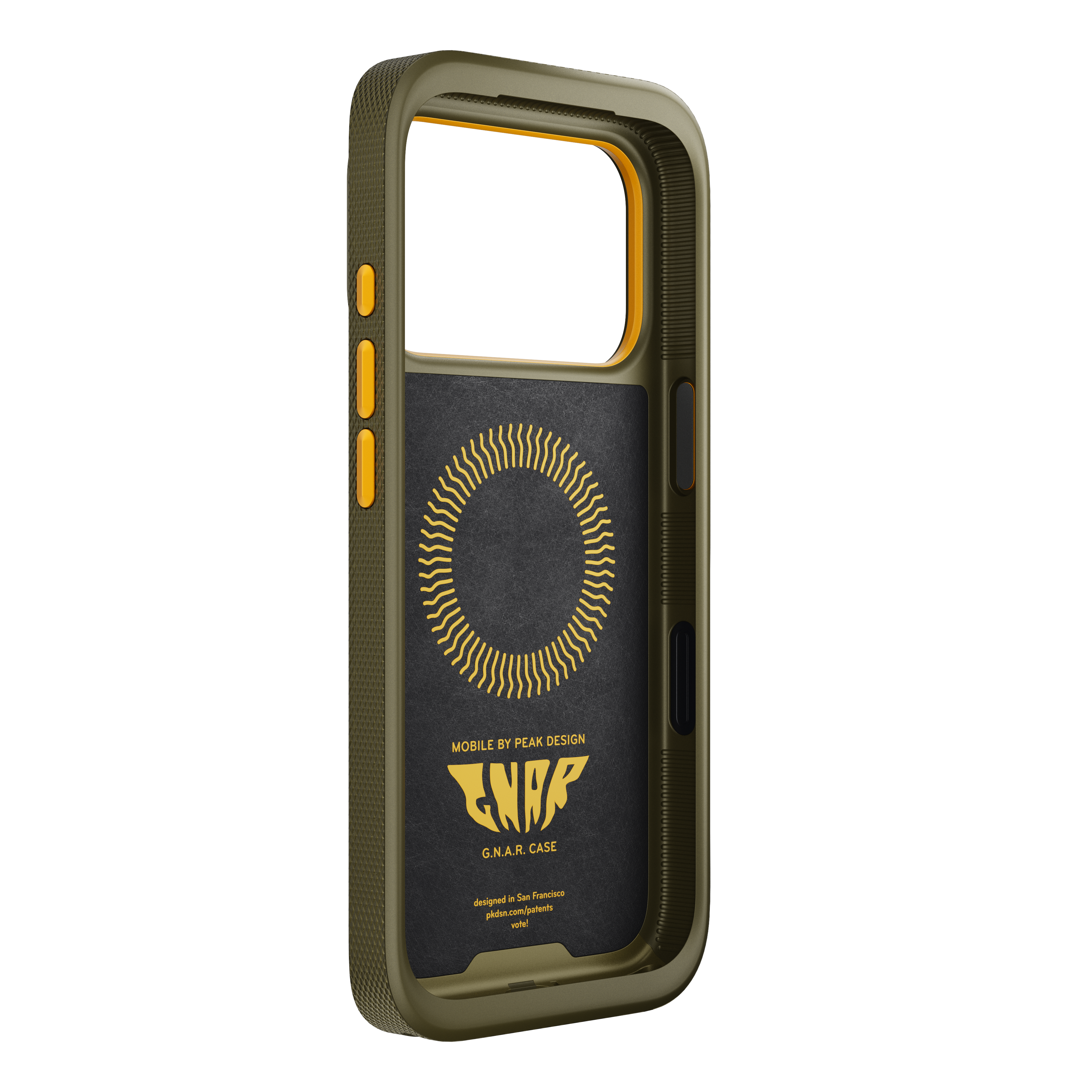 All the protection, ruggedness, and connect-ability that you could ever want from a phone case, yet with a clean and refined aesthetic, the iPhone 17 GNAR case is among our first generation of cases to be Fair Trade Certified. Designed for those individuals who are 'down to clown' but don't want to look like one, GNAR Case is ideal for motorcycling, mountain biking, and the security-loving 'belt-and-suspenders' types. Compared to the Everyday Case, it has a bit more padding—3.2mm thick (vs. 2.4mm), 4.4mm TPU bumper (vs. 3.4mm), raised camera bezel—yet retains a flat, slim profile that feels svelte in your hand and your pocket. A lightweight recycled polycarbonate body features a smooth scratch-and-stain-resistant finish that's easy to clean. A diamond-knurled edge texture and extra-wide machined/anodized aluminum buttons make GNAR Case easy to handle, even with gloves on. A soft Clarino™ microfiber internal liner keeps your phone pristine, and a removeable USB-C port plug prevents dirt and water ingress in outdoor environments. And of course, it contains our brilliant magnetic/mechanical SlimLink™ locking system for instant connection to all Peak Design Mobile mounts, chargers, and accessories. We designed GNAR Case for ultra reliable lightning-fast wireless charging, which can be an issue with some thicker 3rd party cases. It even works with Apple MagSafe chargers and accessories, however compatibility with all 3rd party chargers is not guaranteed.