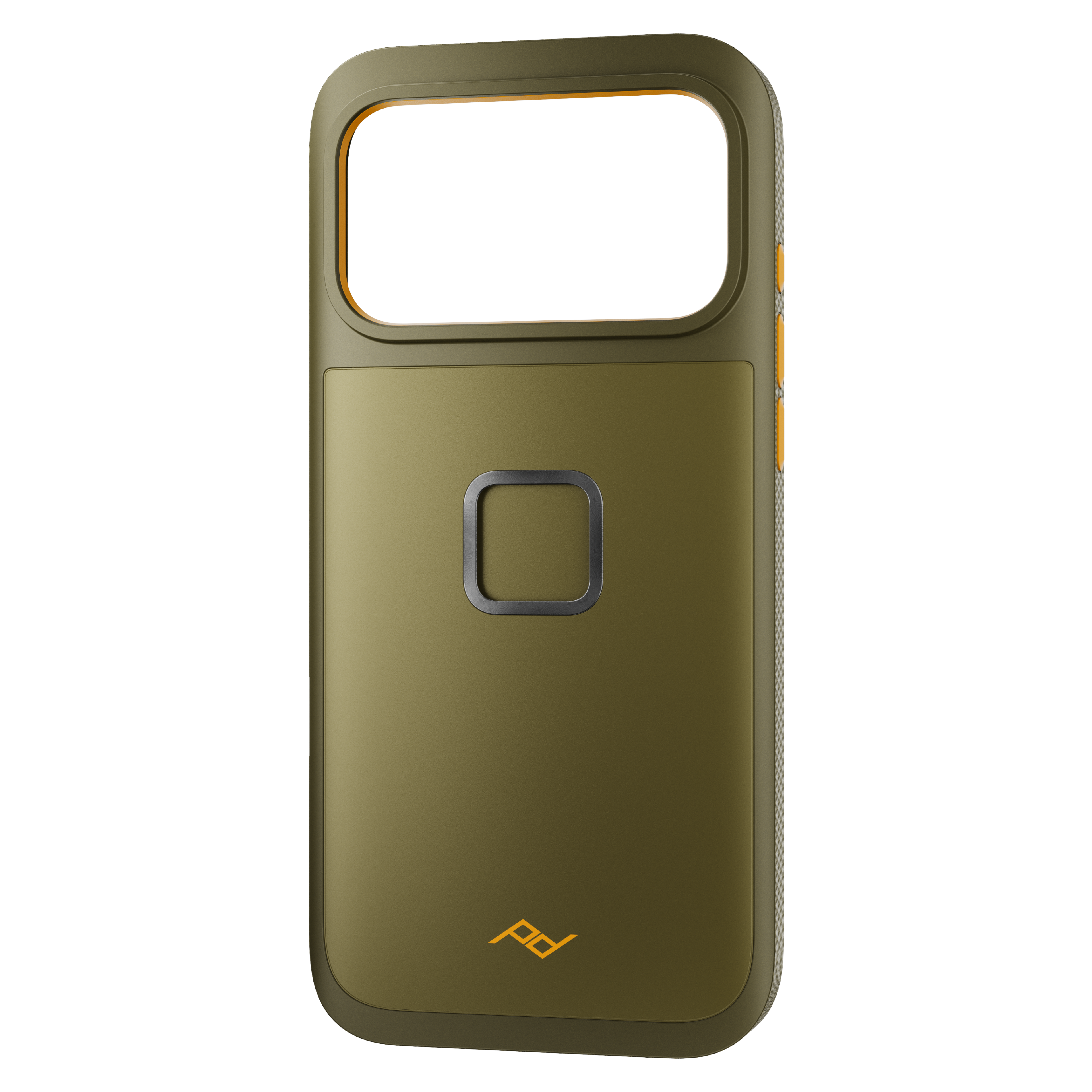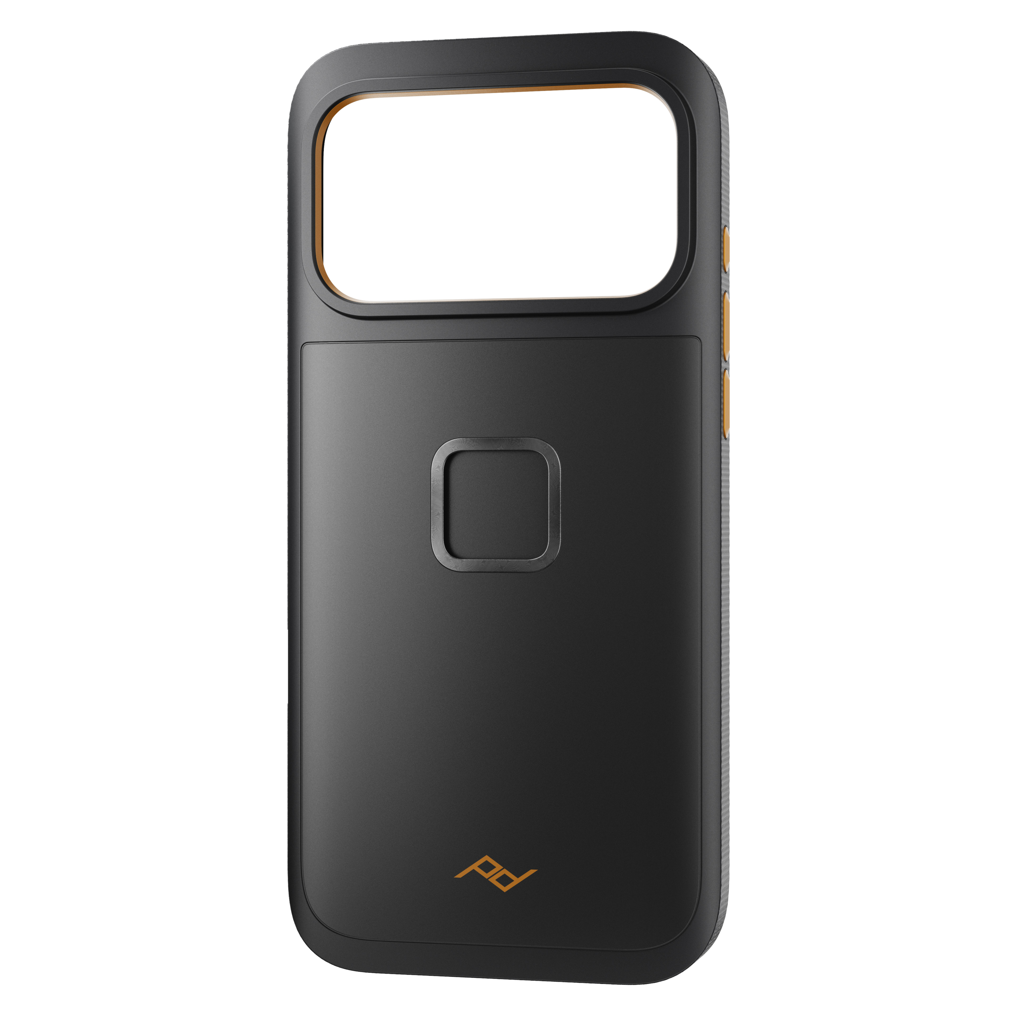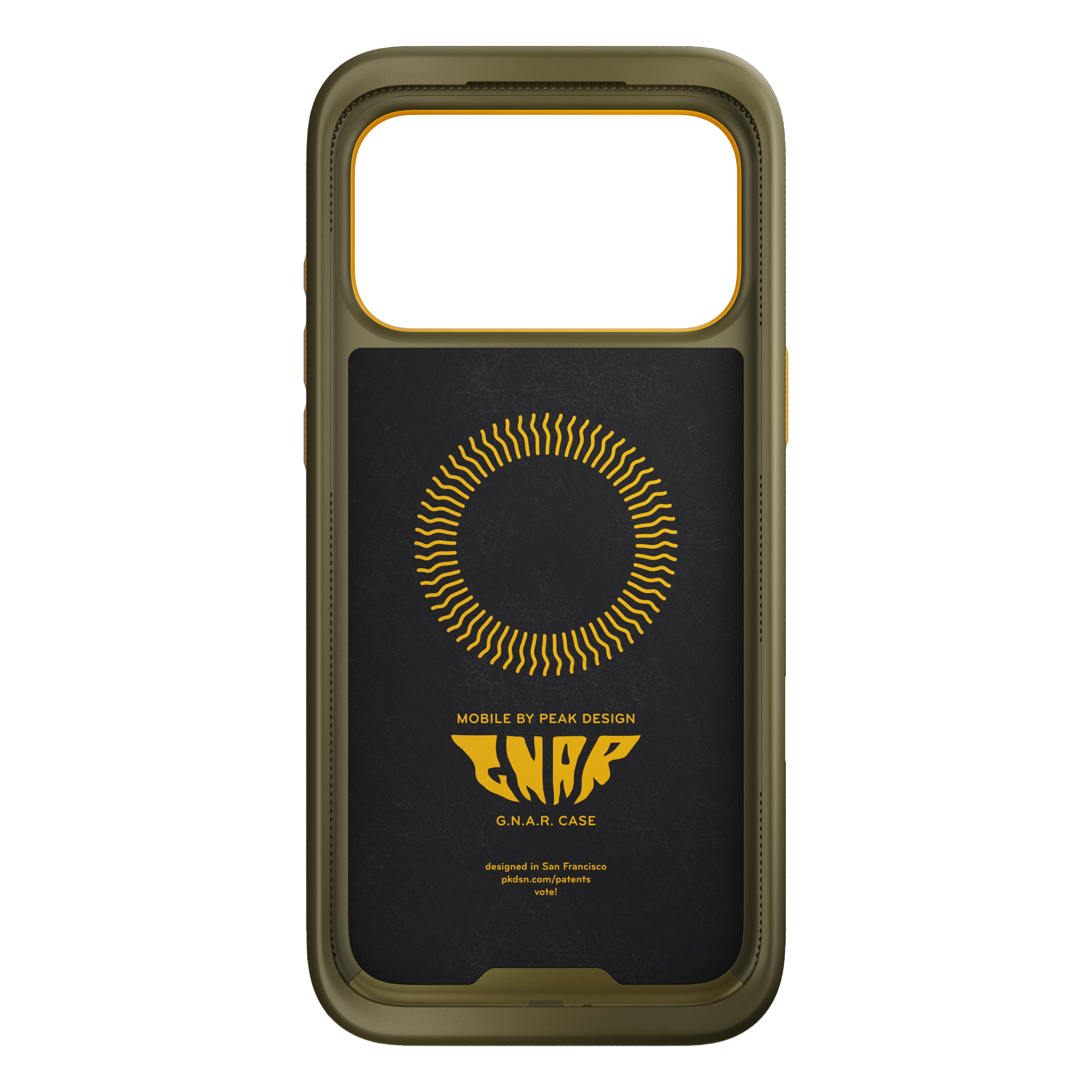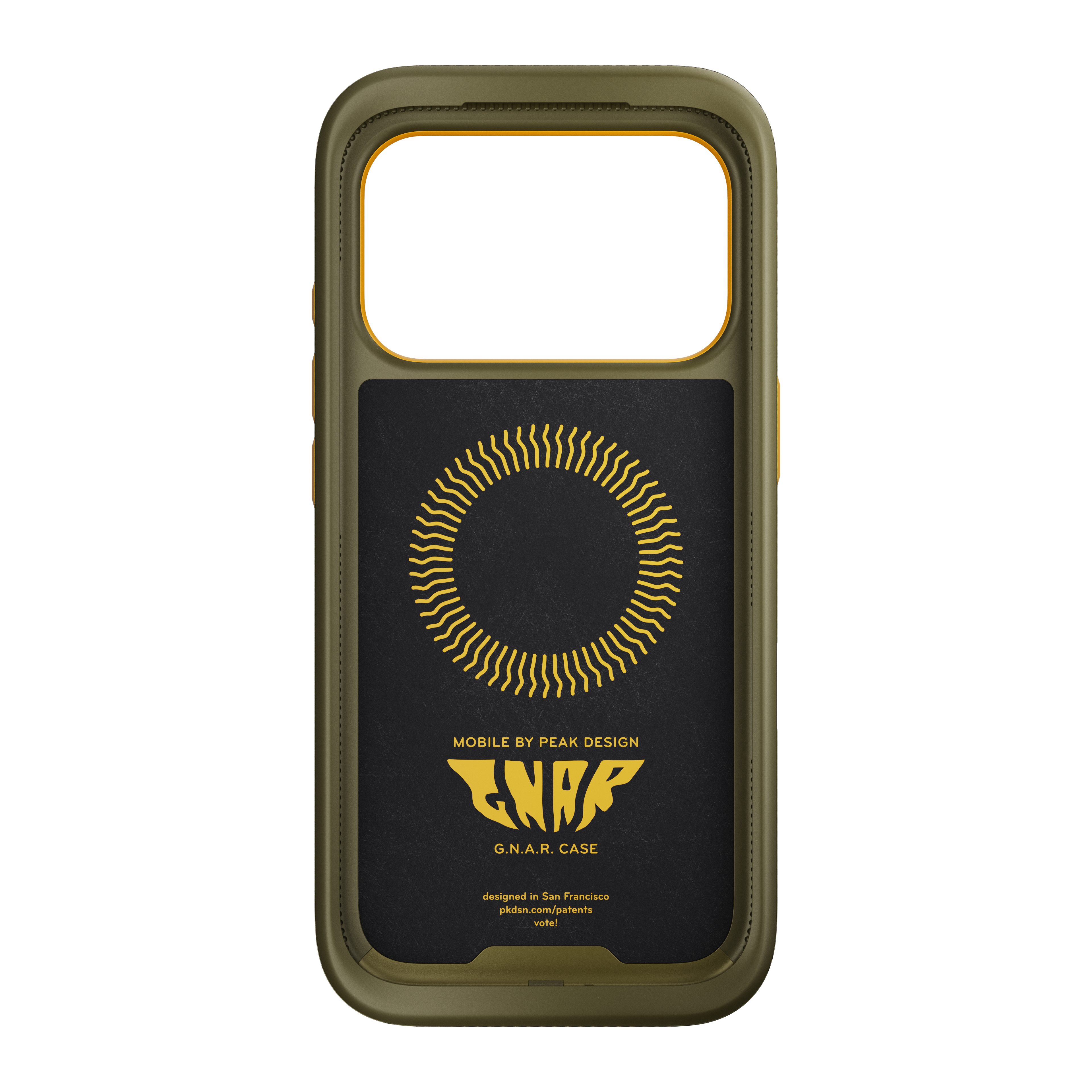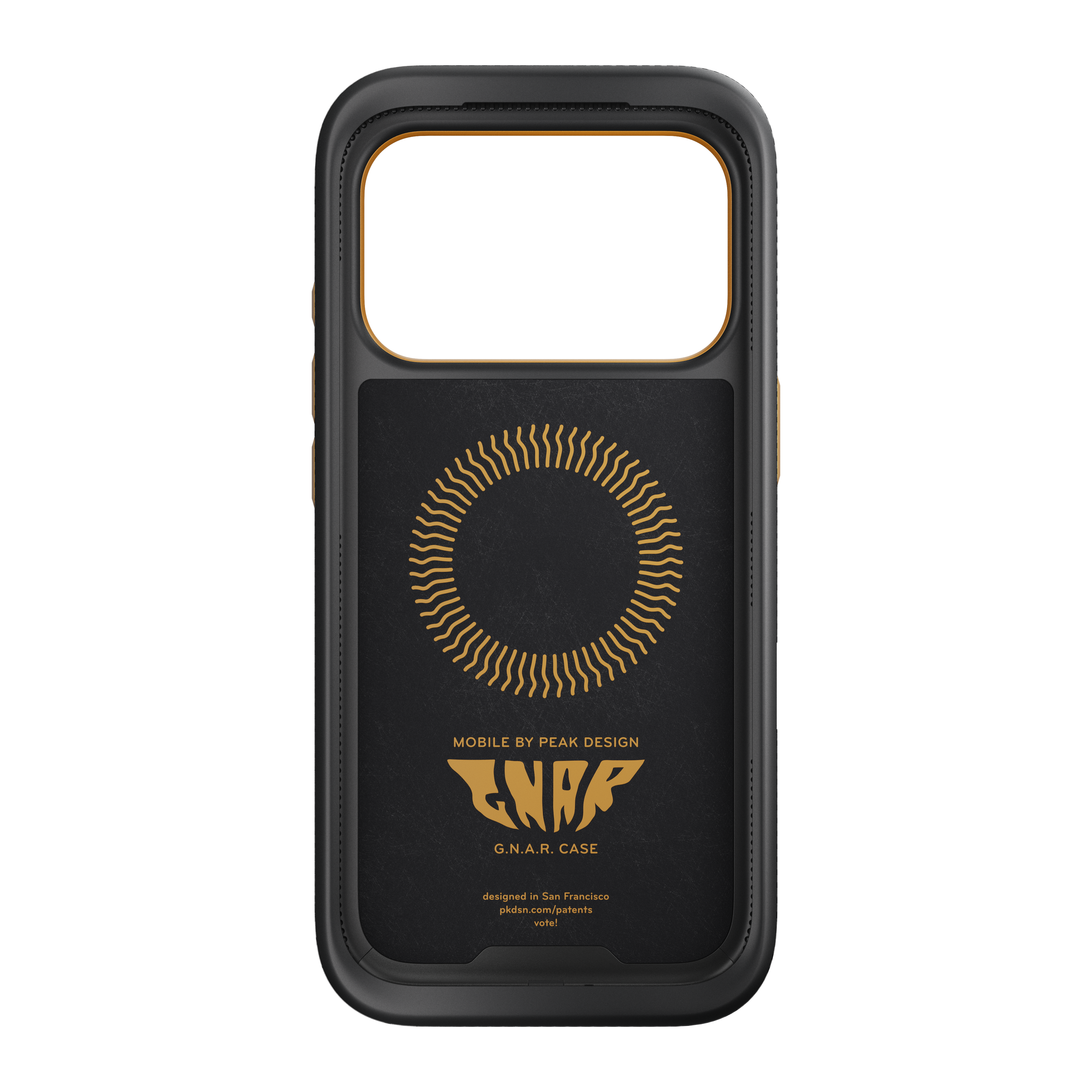 All the protection, ruggedness, and connect-ability that you could ever want from a phone case, yet with a clean and refined aesthetic, the iPhone 17 GNAR case is among our first generation of cases to be Fair Trade Certified. Designed for those individuals who are 'down to clown' but don't want to look like one, GNAR Case is ideal for motorcycling, mountain biking, and the security-loving 'belt-and-suspenders' types. Compared to the Everyday Case, it has a bit more padding—3.2mm thick (vs. 2.4mm), 4.4mm TPU bumper (vs. 3.4mm), raised camera bezel—yet retains a flat, slim profile that feels svelte in your hand and your pocket. A lightweight recycled polycarbonate body features a smooth scratch-and-stain-resistant finish that's easy to clean. A diamond-knurled edge texture and extra-wide machined/anodized aluminum buttons make GNAR Case easy to handle, even with gloves on. A soft Clarino™ microfiber internal liner keeps your phone pristine, and a removeable USB-C port plug prevents dirt and water ingress in outdoor environments. And of course, it contains our brilliant magnetic/mechanical SlimLink™ locking system for instant connection to all Peak Design Mobile mounts, chargers, and accessories. We designed GNAR Case for ultra reliable lightning-fast wireless charging, which can be an issue with some thicker 3rd party cases. It even works with Apple MagSafe chargers and accessories, however compatibility with all 3rd party chargers is not guaranteed.