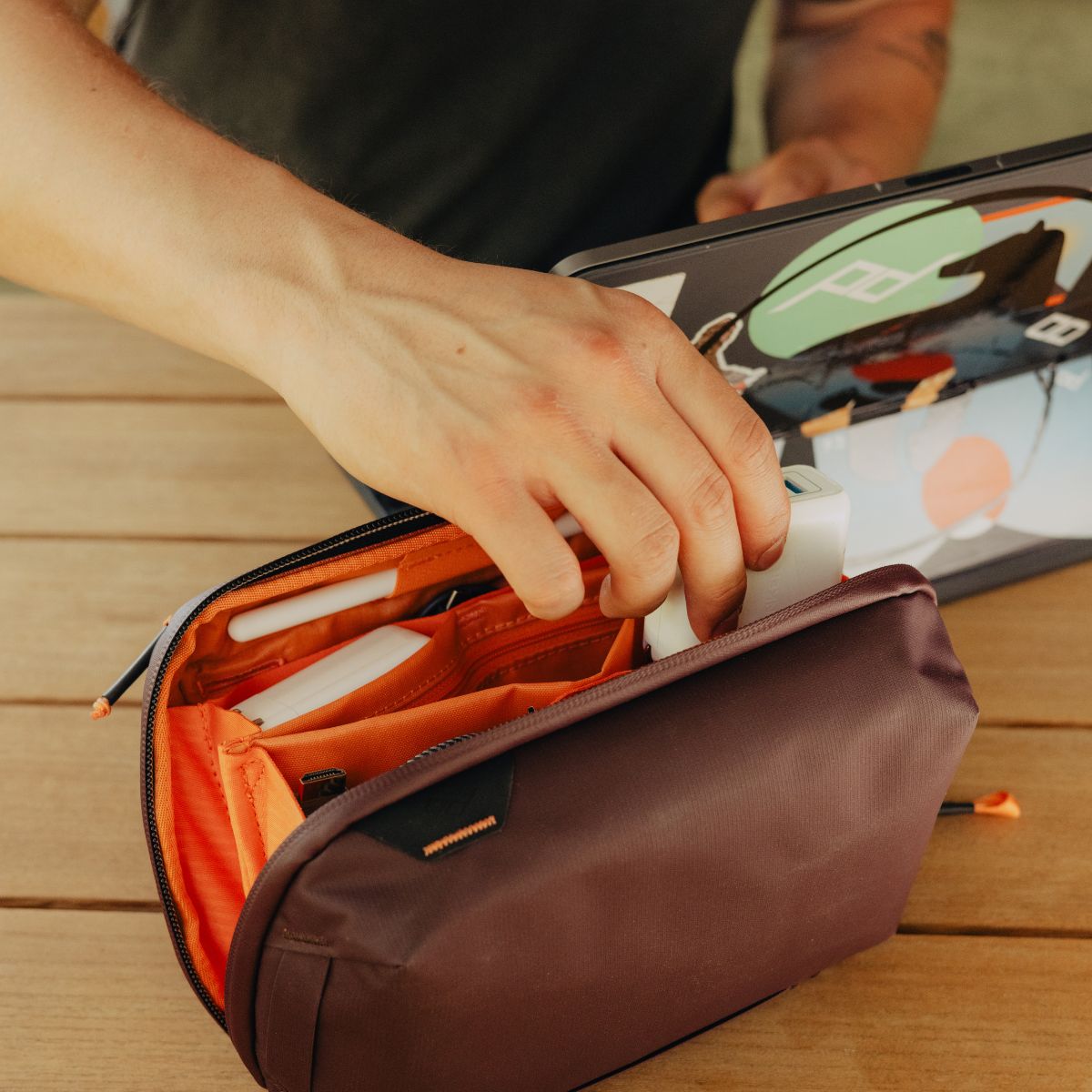 Whether storing cables, everyday gear, or travel essentials, Tech Pouch offers unrivaled organization and ease of access. Origami-style pockets create enormous spatial efficiency, letting you pack more into a smaller space while keeping your items neatly organized and easy to find. Elastic accessory loops keep items like pens, knives, SD cards, and batteries always within reach. Exterior handles and a clamshell-style opening make this pouch a delight to hold and access. External zip pocket has a cable pass-through for easy device charging. The 200D recycled nylon canvas shell is weatherproof and aesthetically clean.