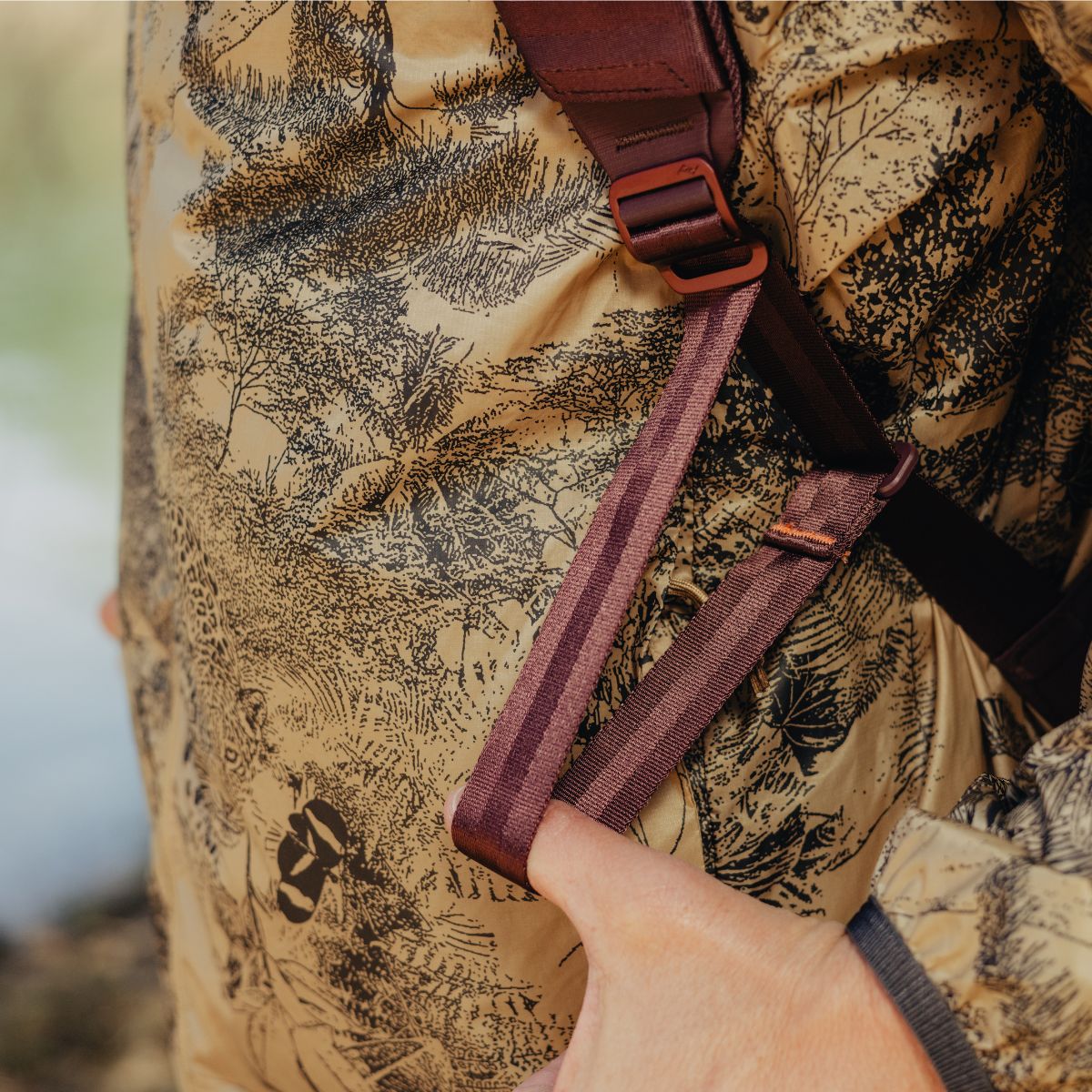 Weatherproof 100% recycled 400D nylon canvas external shell. DWR impregnated and double poly coated for water resistance. Sage & Midnight fabrics are Bluesign approved.