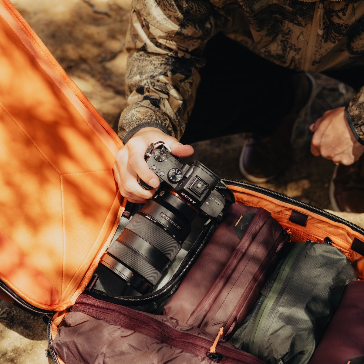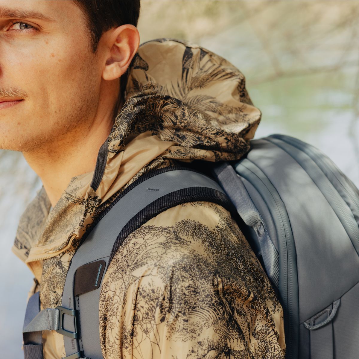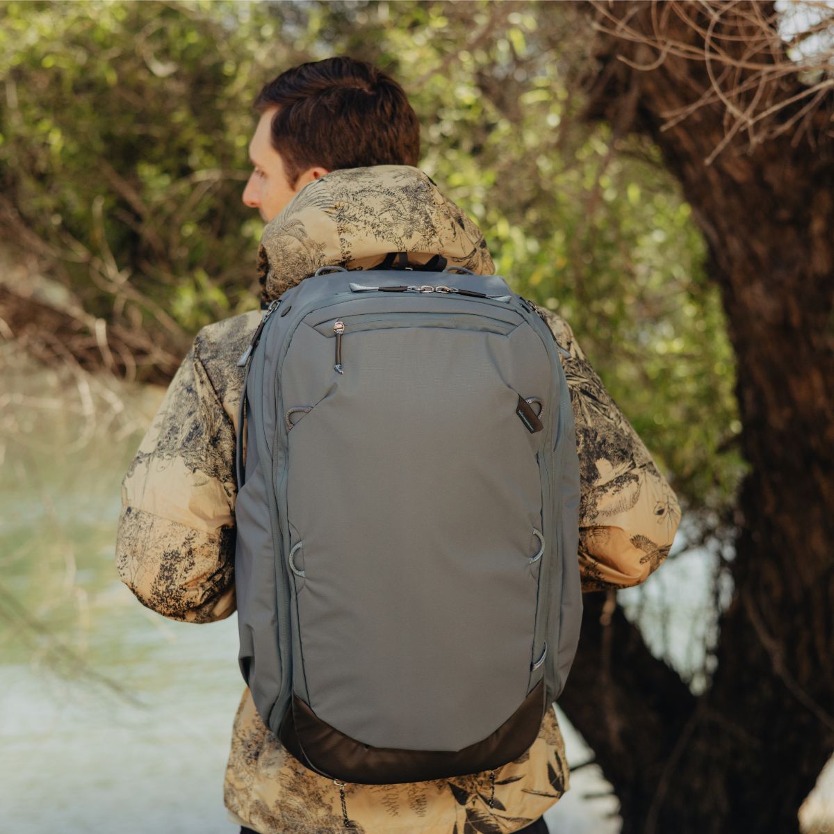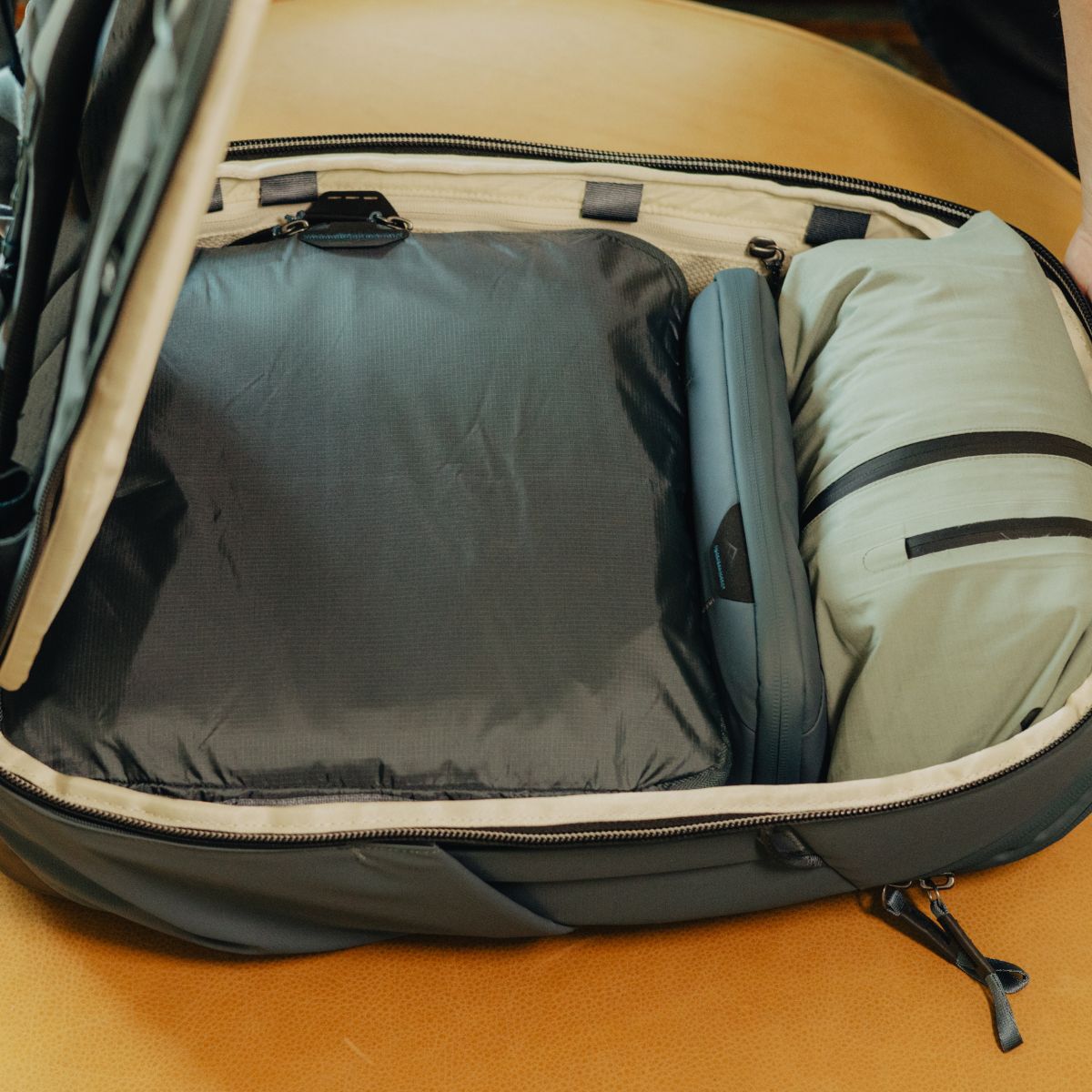 Works seamlessly with Peak Design Packing Cubes, Camera Cubes, and Pouches, sold separately. For similar features in a smaller bag, check out the 30L Travel Backpack.