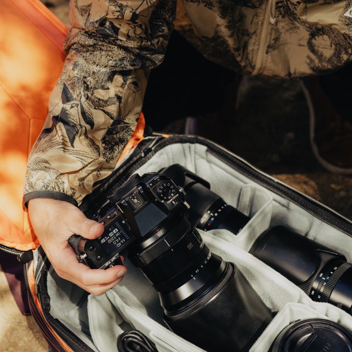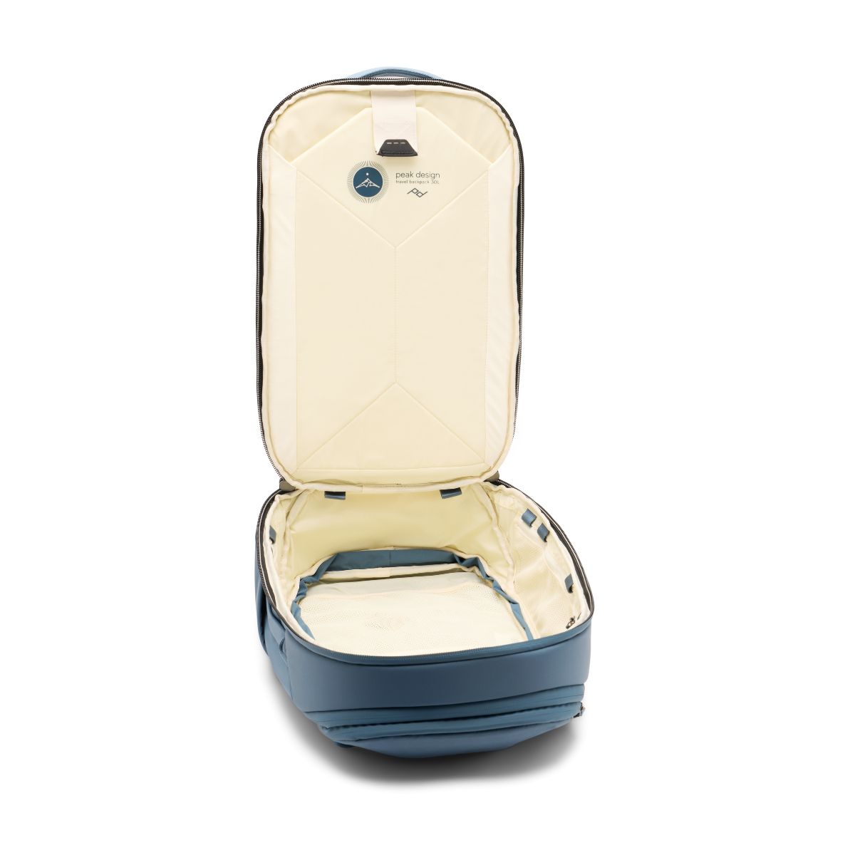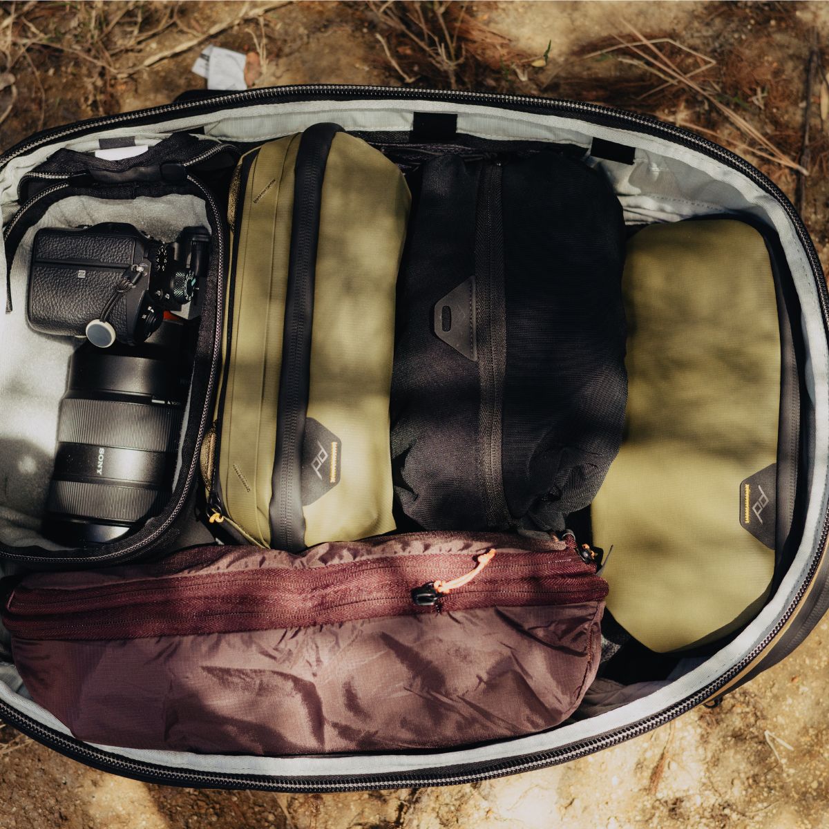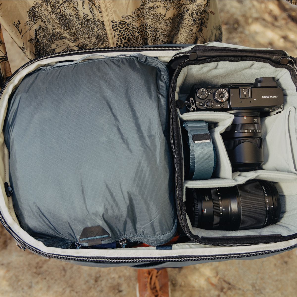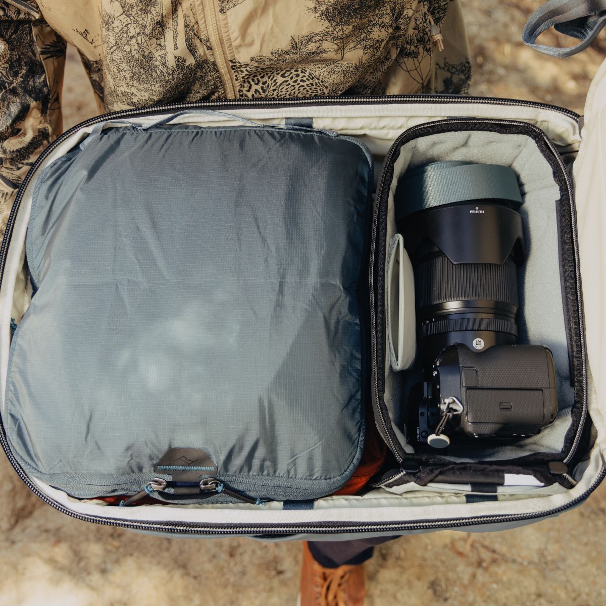 Works seamlessly with Peak Design Packing Cubes and Pouches, sold separately. Fits Peak Design Camera Cubes, but only in its expanded form. For optimal photo gear carry, we recommend the larger 45L Travel Backpack.
